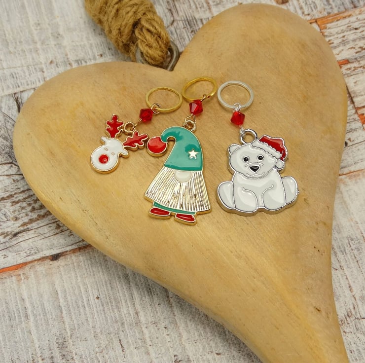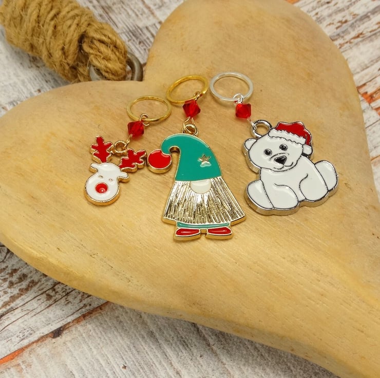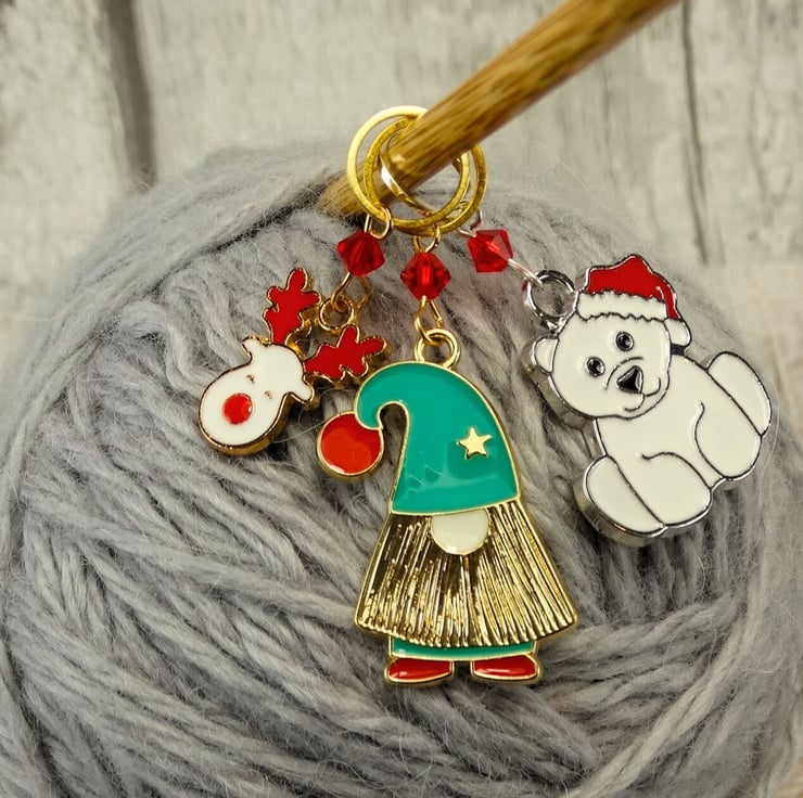 Bring festive cheer to your knitting and crochet projects with our Gonk, Reindeer, & Polar Bear Stitch Markers! This delightful set of three features adorable enamel charms paired with sparkling red crystal beads, adding a touch of holiday magic to your crafting.