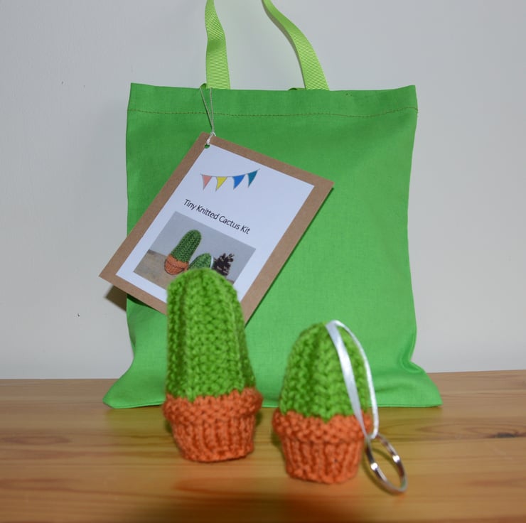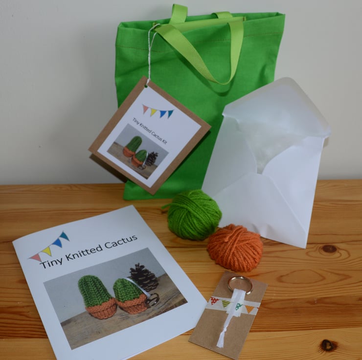 The kit contains all the materials and a printed pattern to make 2 really cute little cacti, one for your desk, and the other a keyring, supplied in a matching mini tote bag.