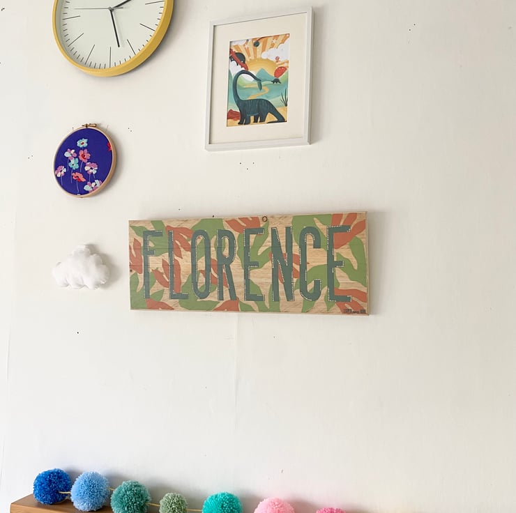 Add a pop of colour to any room with this beautiful vibrant dual colour dinosaur footprint wooden sign in F&B Yeabridge Green and F&B Red Earth with letters in F&B Green Smoke. Letters are finished with dot detail in F&B Setting Plaster.