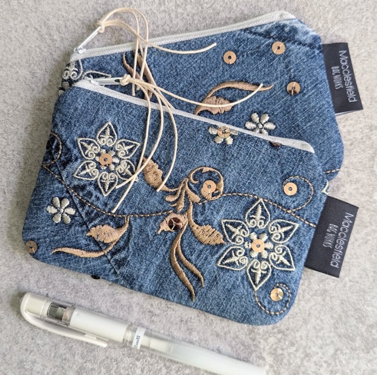 These recycled chambray denim coin purses have been handmade from a denim skirt with an embroidered hemline.
