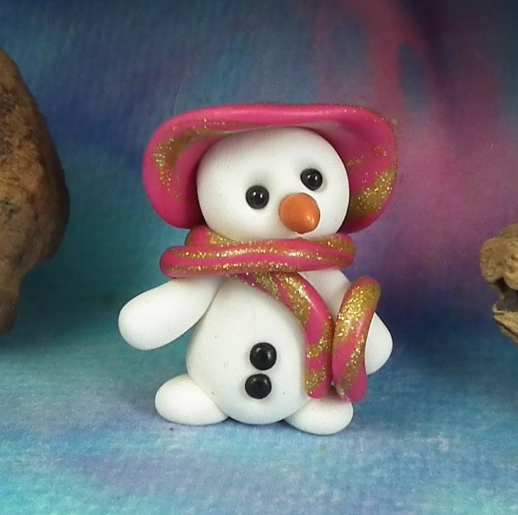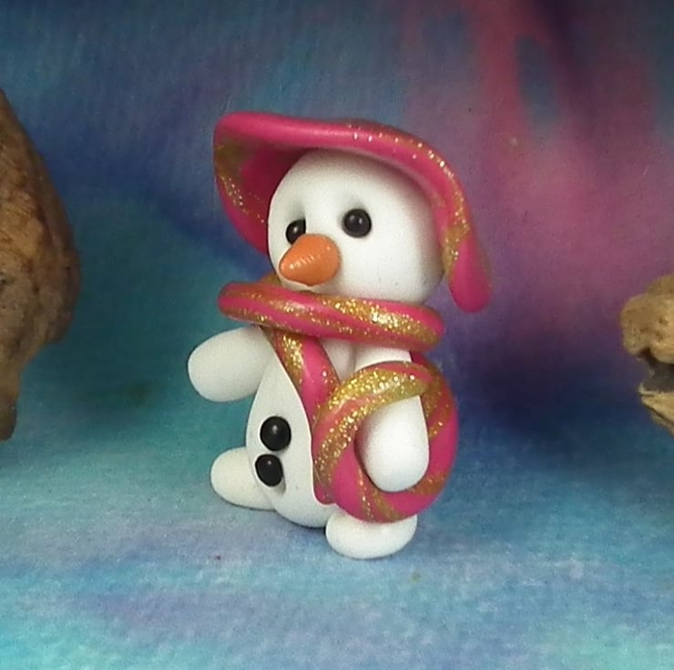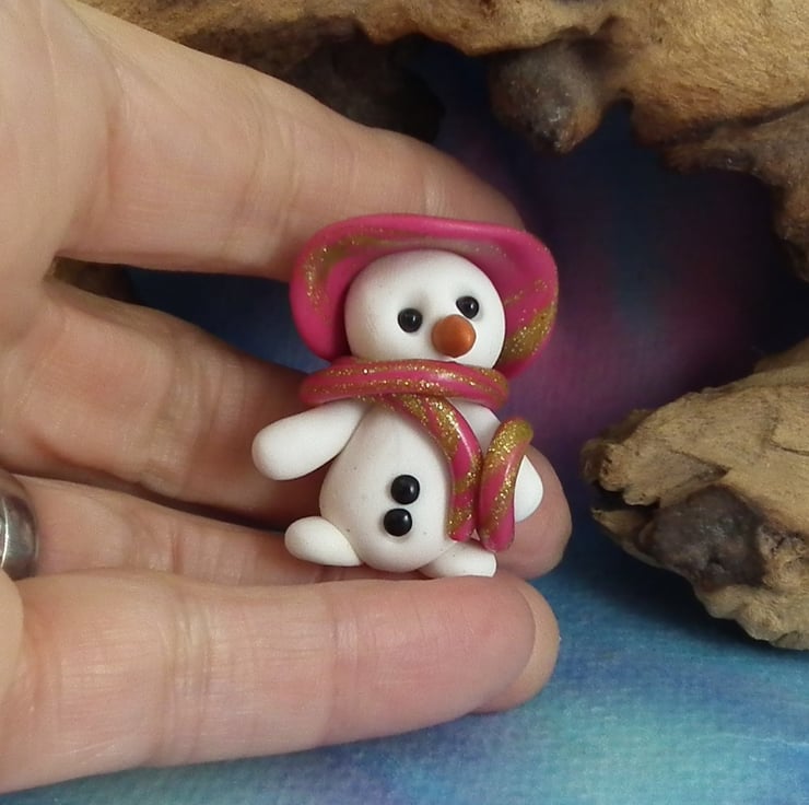 This is a 'one of a kind' creation having been entirely handmade without the use of moulds here at my studio on the Sussex Coast. Modelled with Prosculpt polymers, painted with heat set paints before sealing with lacquer, Tansy the Snowman has sparkling black onyx eyes and carrot nose. Tansy is just one and a half inches tall.