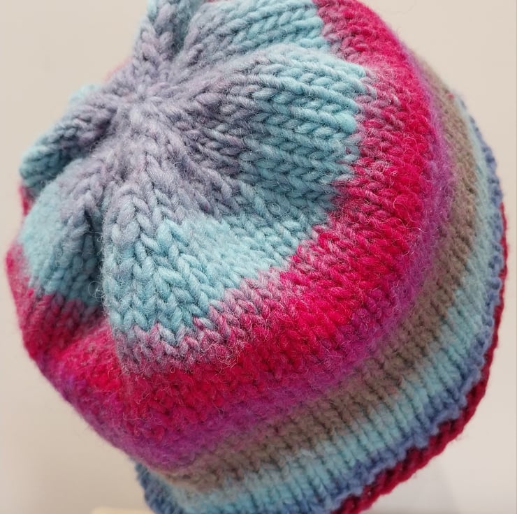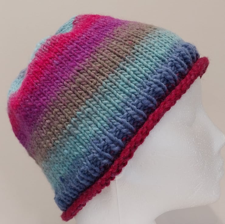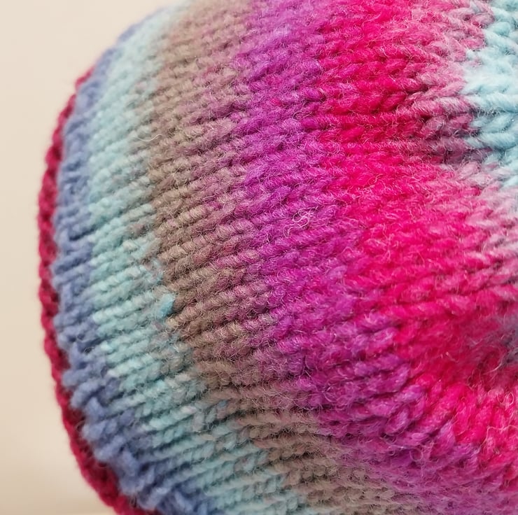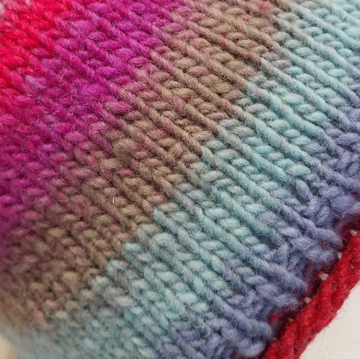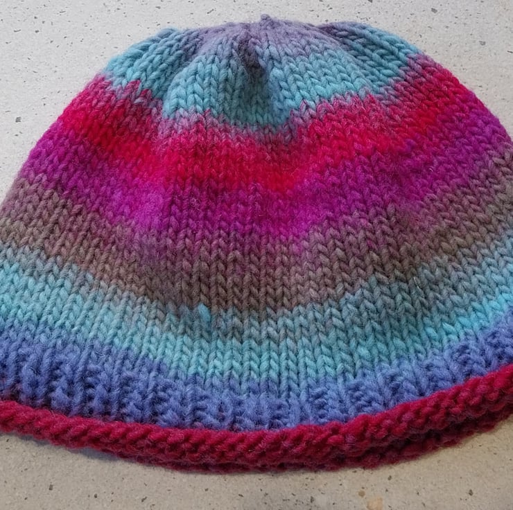 It is knitted on the round to give a seamless finish showing the self striping bands off to their best.