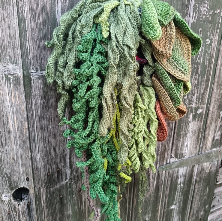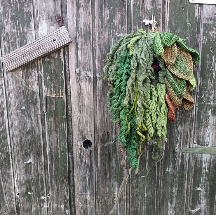 This wreath is made on a 20cm ring covered with crocheted ivy, ferns, mushrooms, pumpkins, leaves etc. Width is about 25cm and length is about 50cm to the tip of the last thread.