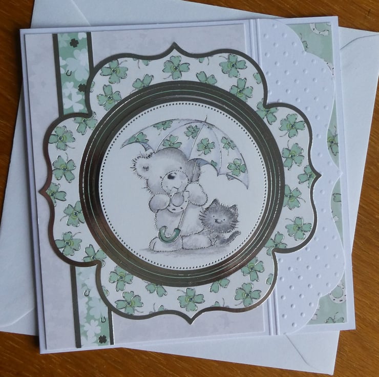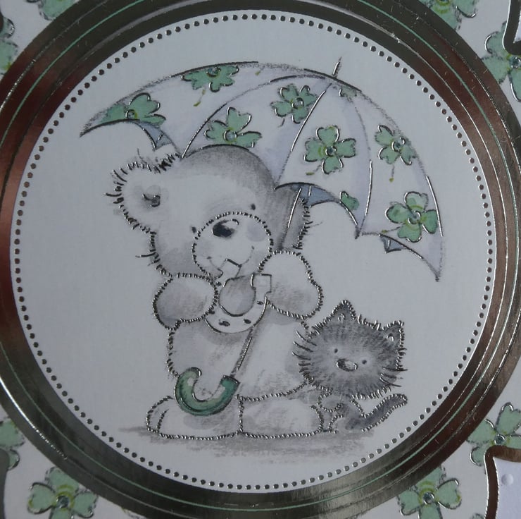The central circular topper has a printed image of a bear holding an umberella patterned with four leaf clovers and holding a horseshoe. To complete the good luck images a black cat sits at the bear's feet. The topper has been raised on foam pads to add dimension.