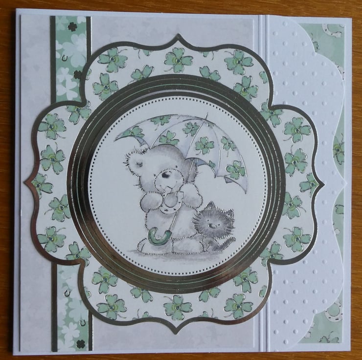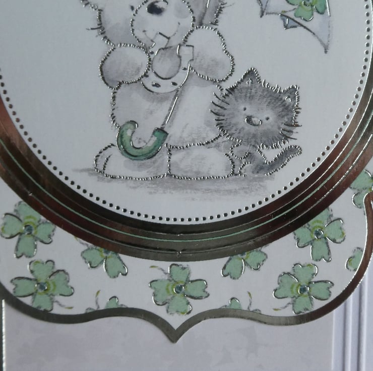 An ornate four leaf clover patterned frame surrounds the main image and a strip of green and silver foiled card runs down the left hand side to complete the design.