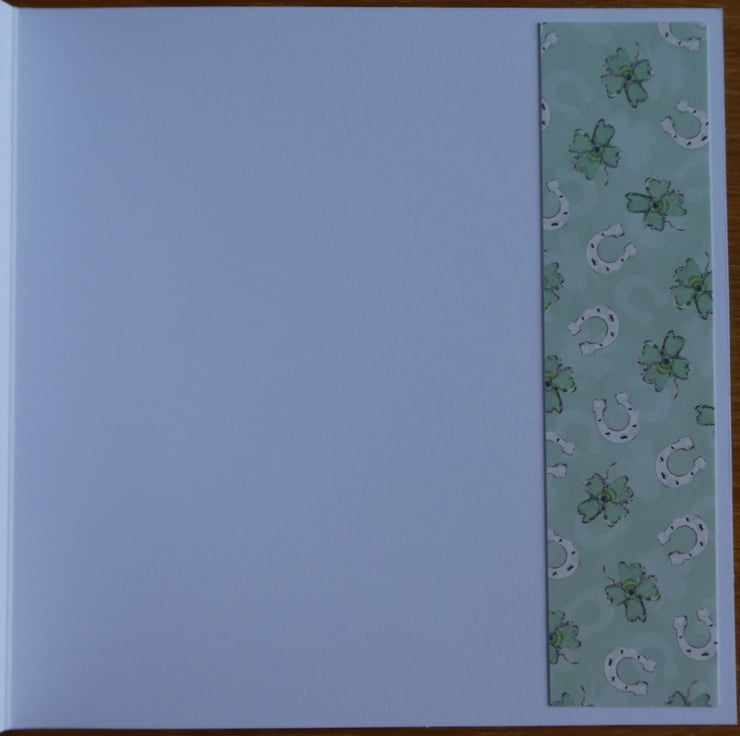 The front of this card has a scalloped edge detail on the right hand side, which allows the strip of four leaf clover and horseshoe patterned card running down the edge of the inside of the card to show through.