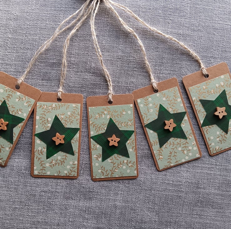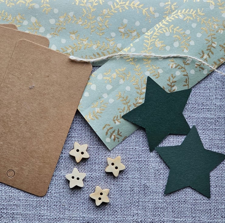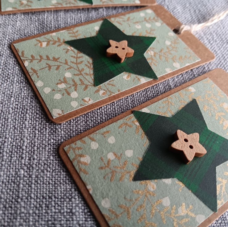 Unique gift tags made using offcuts of pretty recycled cotton paper in greens with white berries and gold twigs. Perfect to enhance your gifts this Christmas.