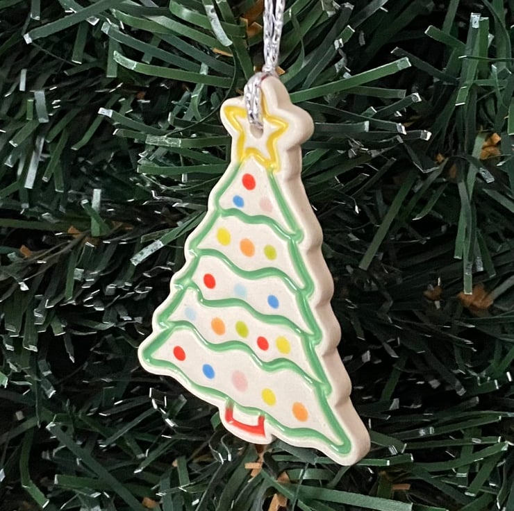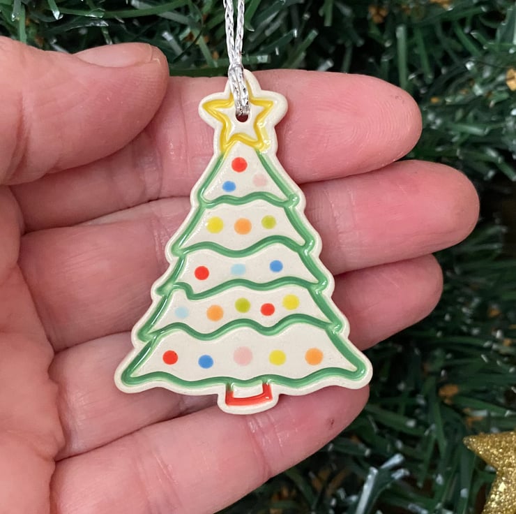 This little Christmas tree is made from white earthenware clay, imprinted with pattern and finished in a bright, glossy glaze. It has been fired in an electric kiln twice, once to the bisque stage and then a second firing for the glaze. Perfect for adding to a gift to make it extra special or even just for hanging on the tree. Measures 5cm x 4cm