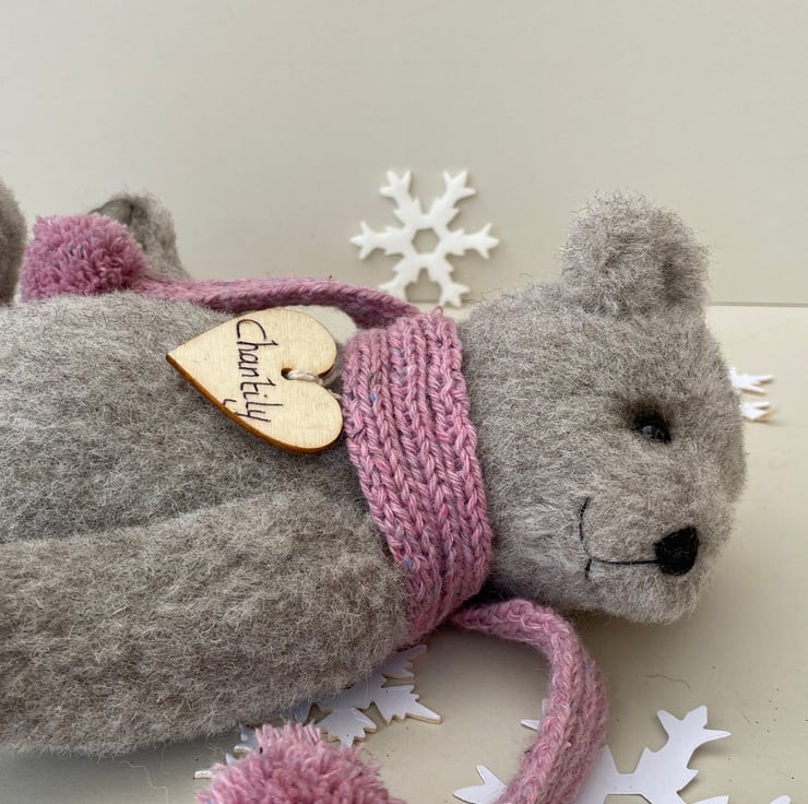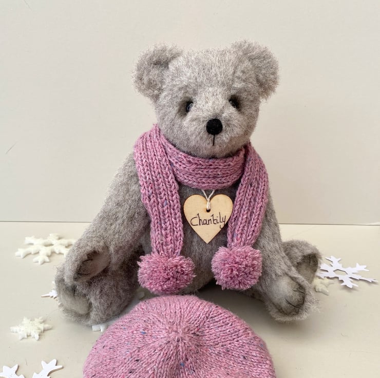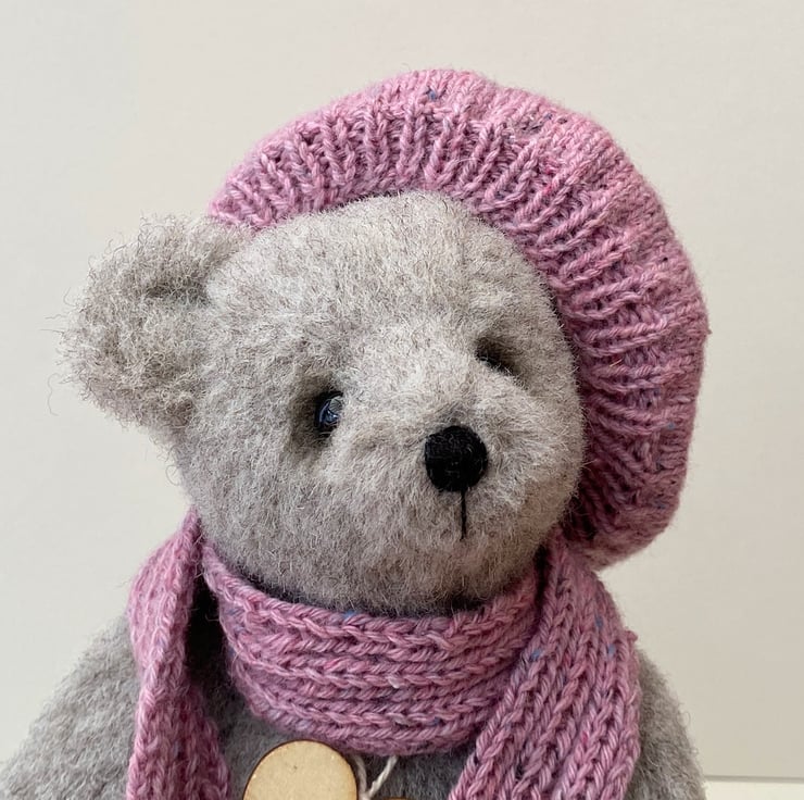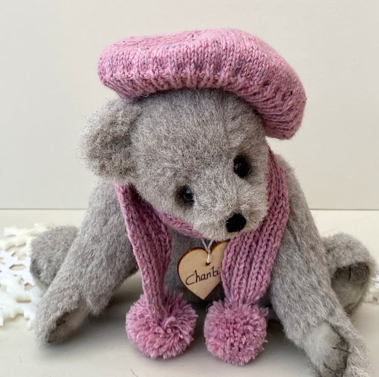A winter bear wearing a hand knitted beret and matching scarf which is finished with pompoms in a lovely flecked dusky pink dk mixed cotton and wool yarn.