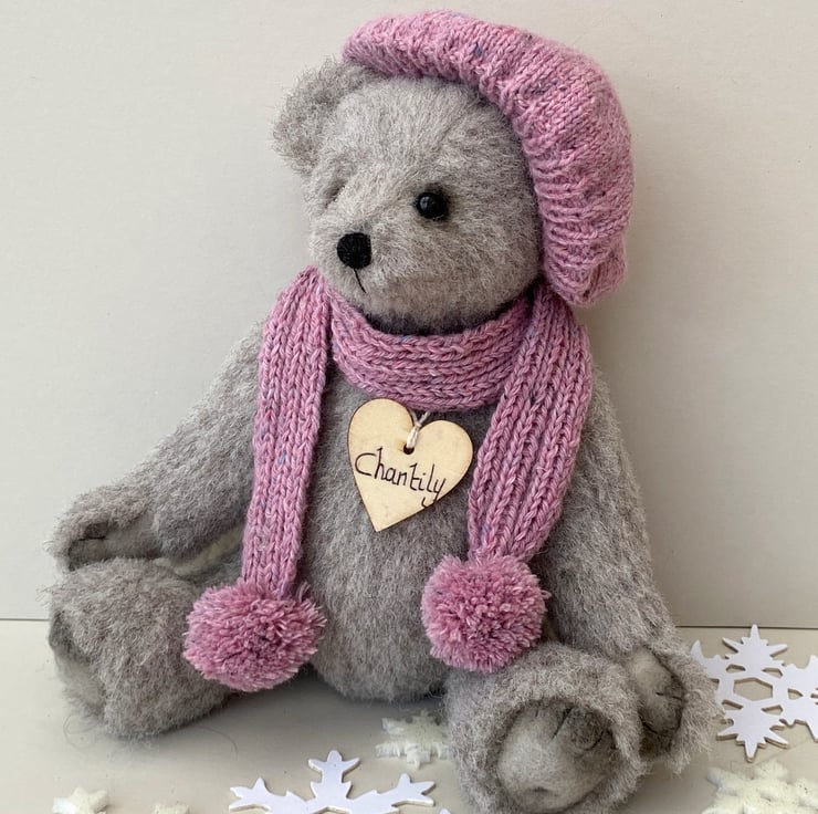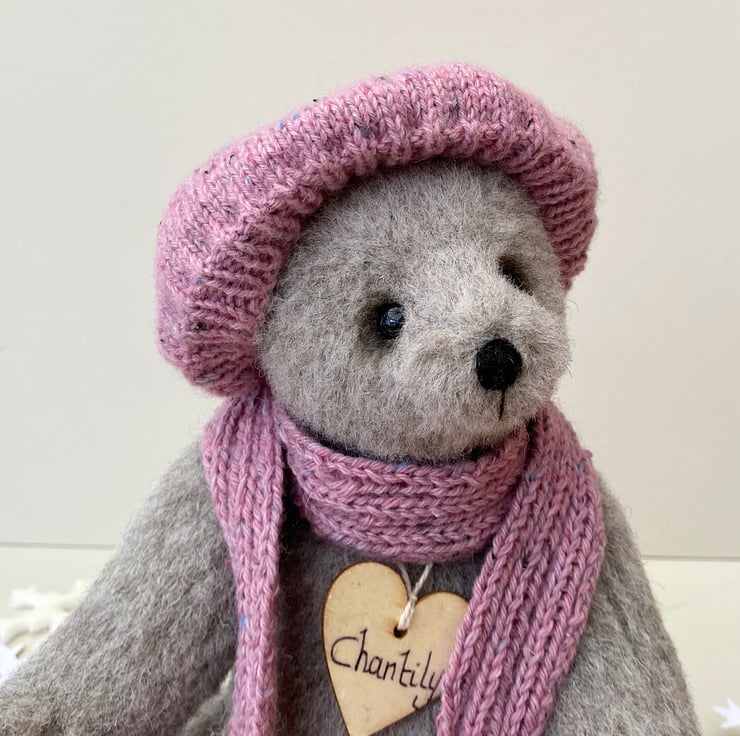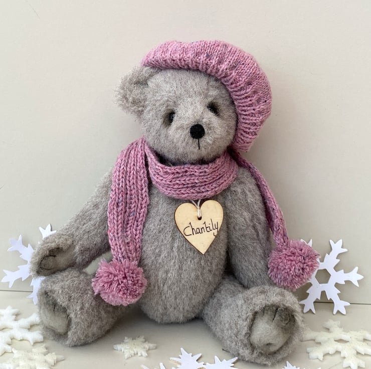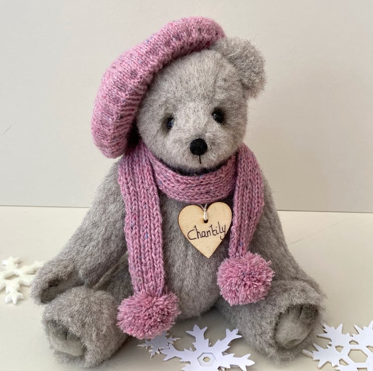 Chantily, a winter bear, handcrafted from lovely dense alpaca mohair in cloud grey which is a medium grey with warm beige undertones.