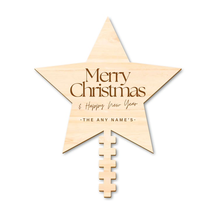 Add a touch of personalised charm to your Christmas tree with this beautifully crafted wooden star tree topper. Engraved with "Merry Christmas & Happy New Year" and your custom family name, this elegant decoration is the perfect festive addition to your home.