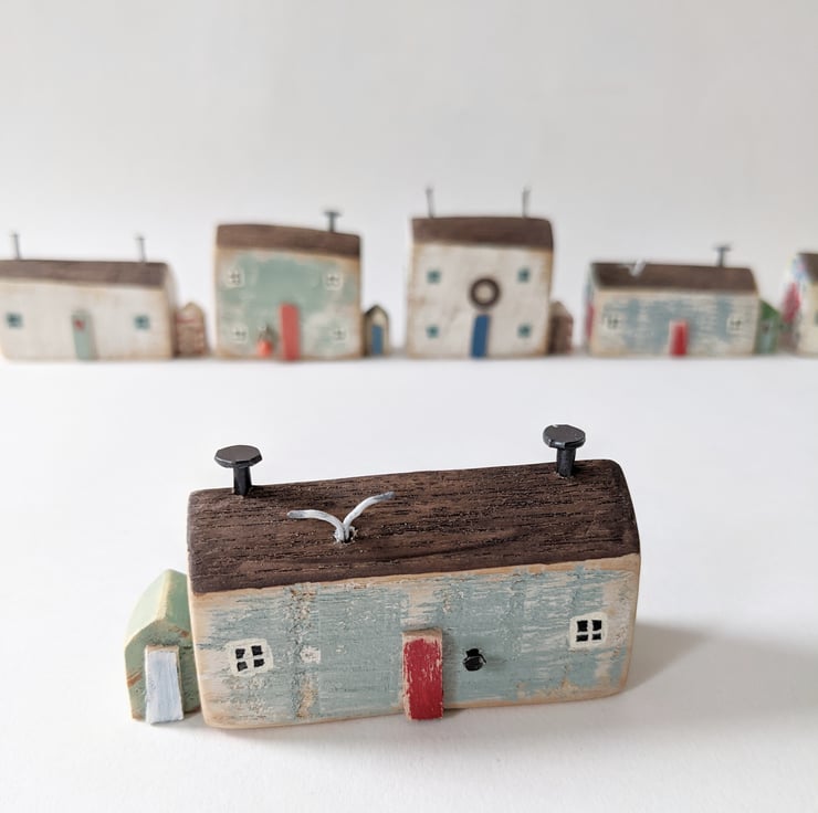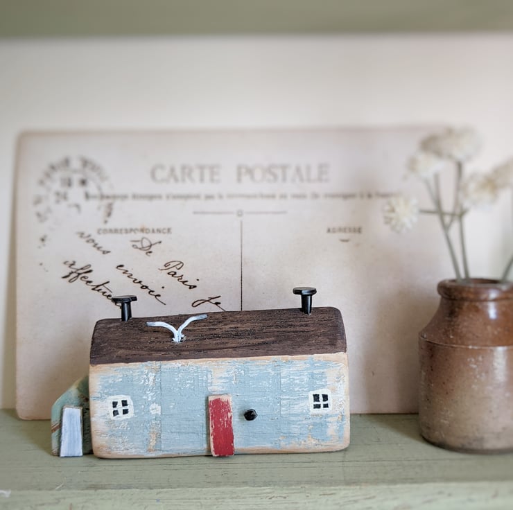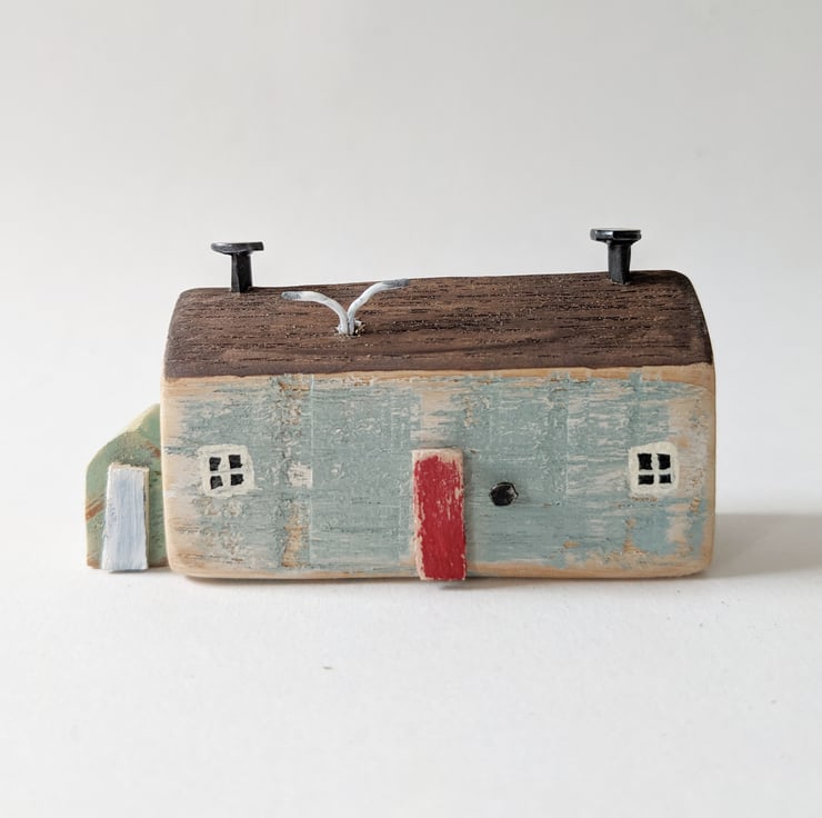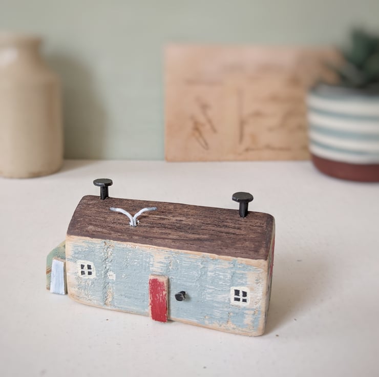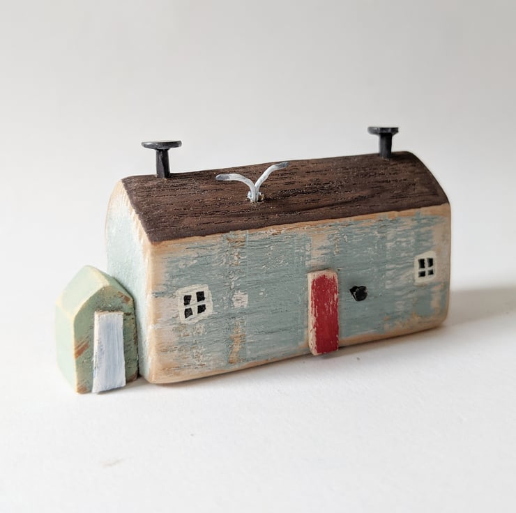 A hand carved and painted little rustic cottage, just like those around the English coast. A bit ramshackle and in need of a spruce up, but a perfect perch for the seagulls!