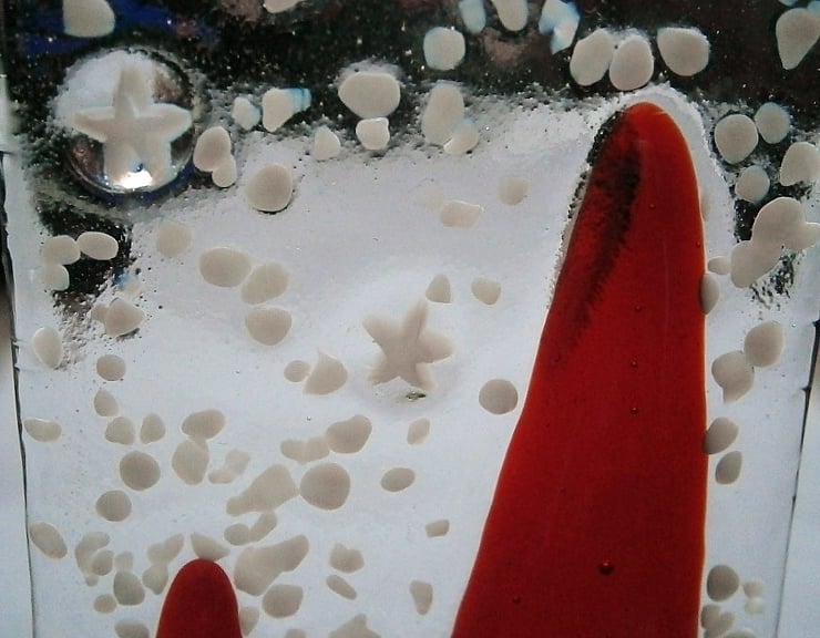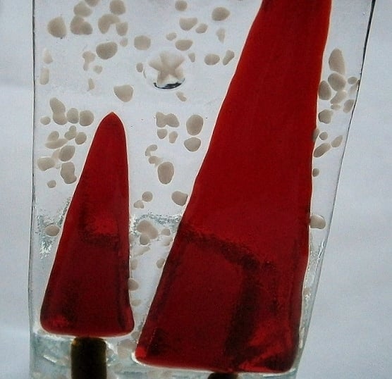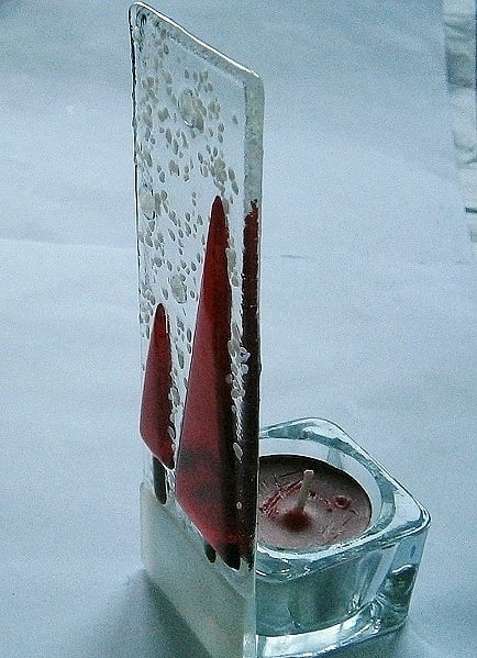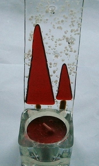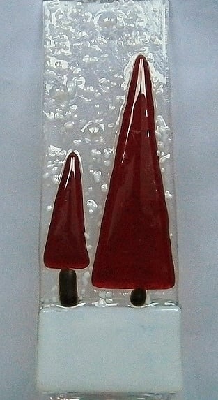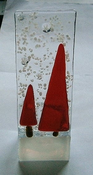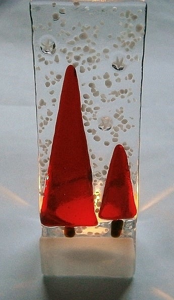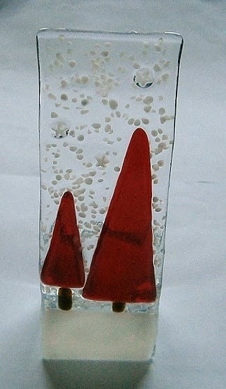 Add a festive glow to your table/decorations with a fused glass panel with 2 red trees in a snowy scene attached to a clear glass tealight or candle holder.
