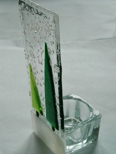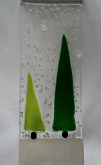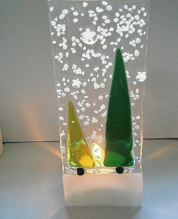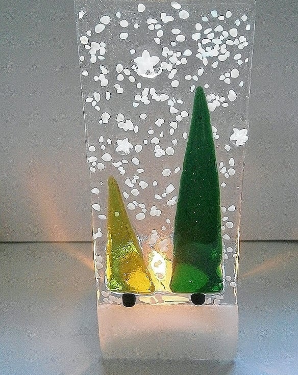 Add a festive glow to your table/decorations with a fused glass panel with 2 shades of green trees in a snowy scene attached to a clear glass tealight or candle holder