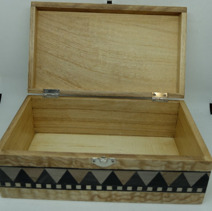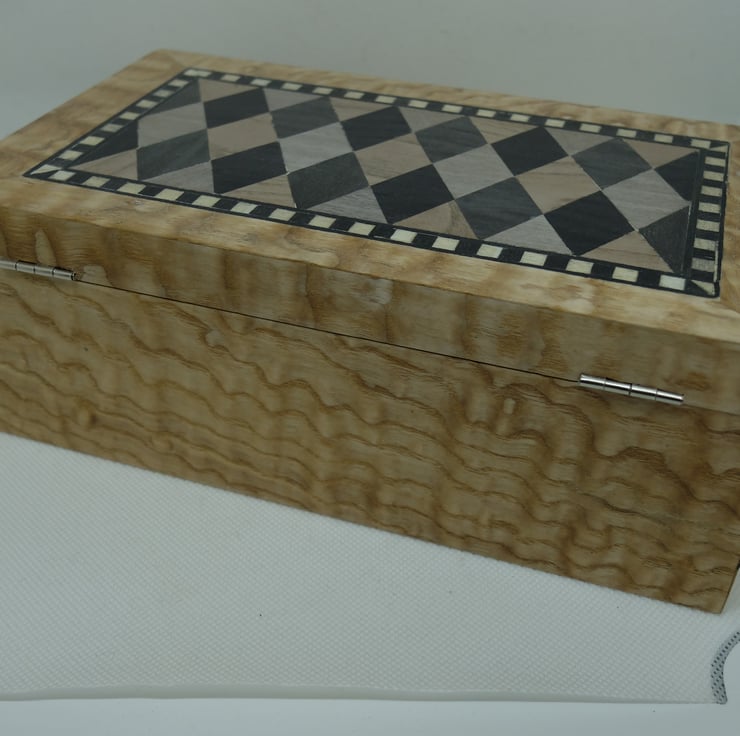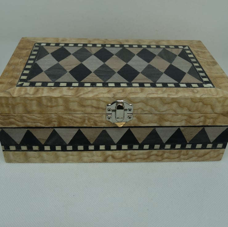 A wooden box veneered with a diamond design to the lid and a triangle border to the edges. The main veneer is Lacewood. Hinged lid with a clasp to the front.