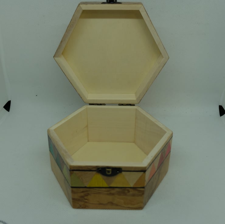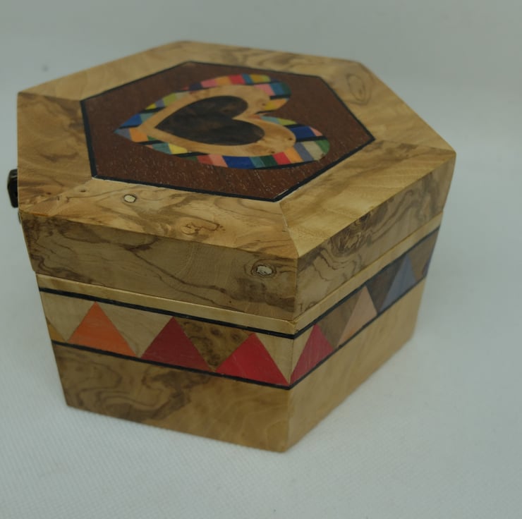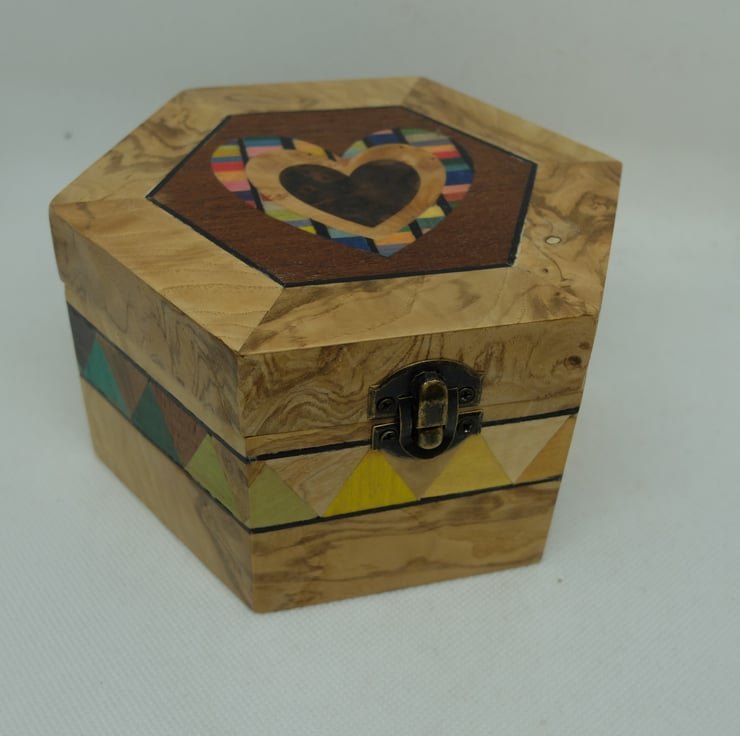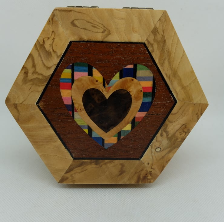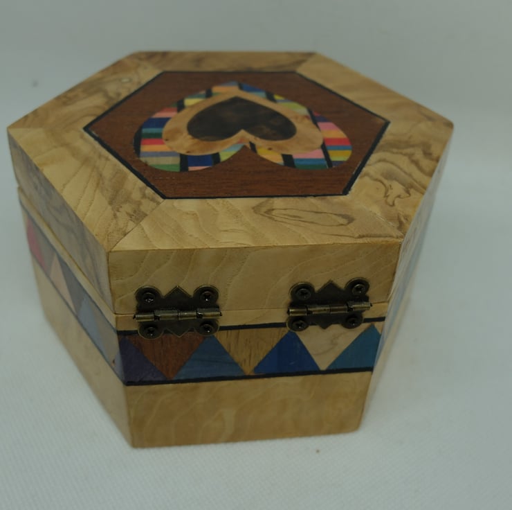 A medium size lidded hexagonal box with colourful real wood veneers in a heart design to lid and colourful triangles border to sides.