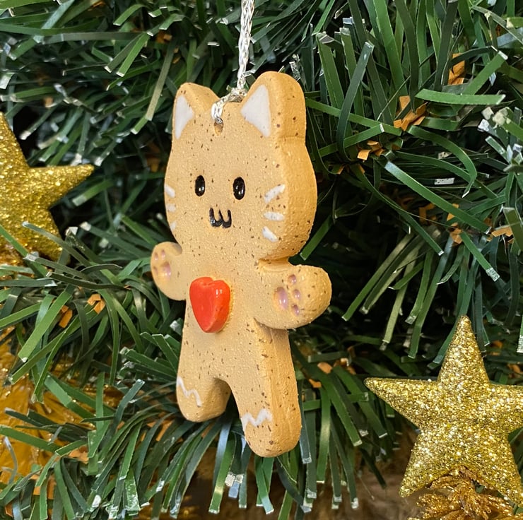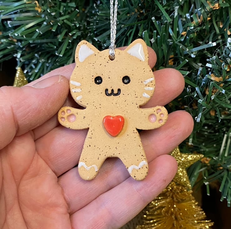 This cute little gingerbread cat decoration is made from a speckled earthenware clay to give the illusion of being made out of real biscuit! It is finished with a white icing style glaze and cute little candy pink paws. It's really cheerful! It measures 6cm length and 4.5cm width and 0.5cm deep and hangs from a sparkly string.