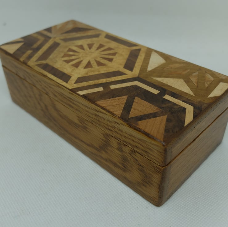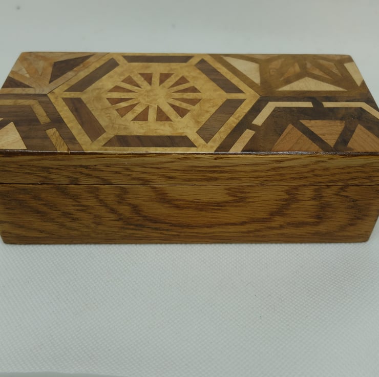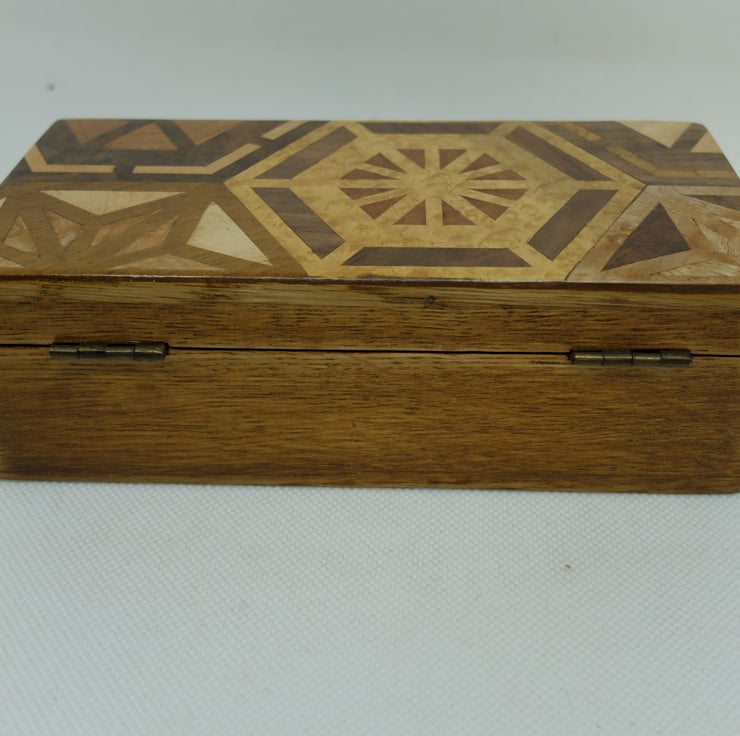 I have left the sides as found but have added a hand veneered design to the lid from my sheet of hexagonal design made for another item ( see other listings).