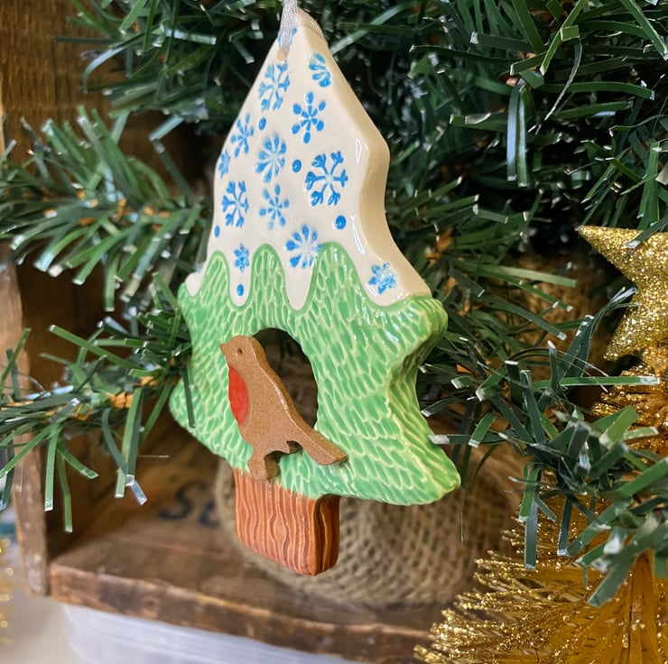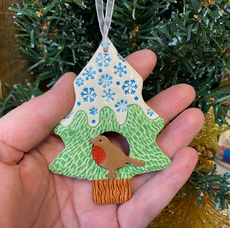 This snowy Christmas tree has been made from white earthenware clay. It has been hand engraved with pine needles and even textured bark! It has been finished with a little robin sitting in the tree. It has been through the process of two firings in the electric kiln. This tree decoration hangs from a cream organza ribbon - ready to hang on your Christmas tree. Each decoration measures 8.5cm x 6.5xm x 1cm deep and is glazed in the front only.