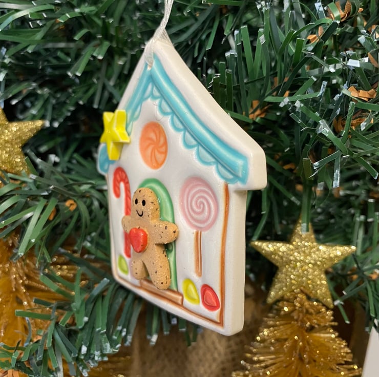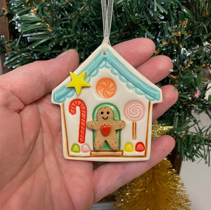 This little gingerbread house Christmas decoration is made from white earthenware clay and decorated with sweeties. A teeny little gingerbread man stands outside his front door!. It measures 6.5cm x 7cm. It has been fired twice and finished with a rich, glossy glaze.