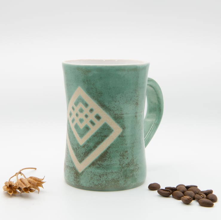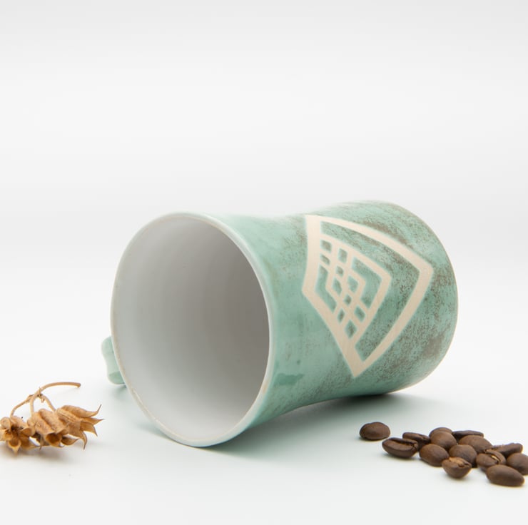 Finished with a white gloss liner, Art Deco Green glaze applied over a vinyl reist art deco design.