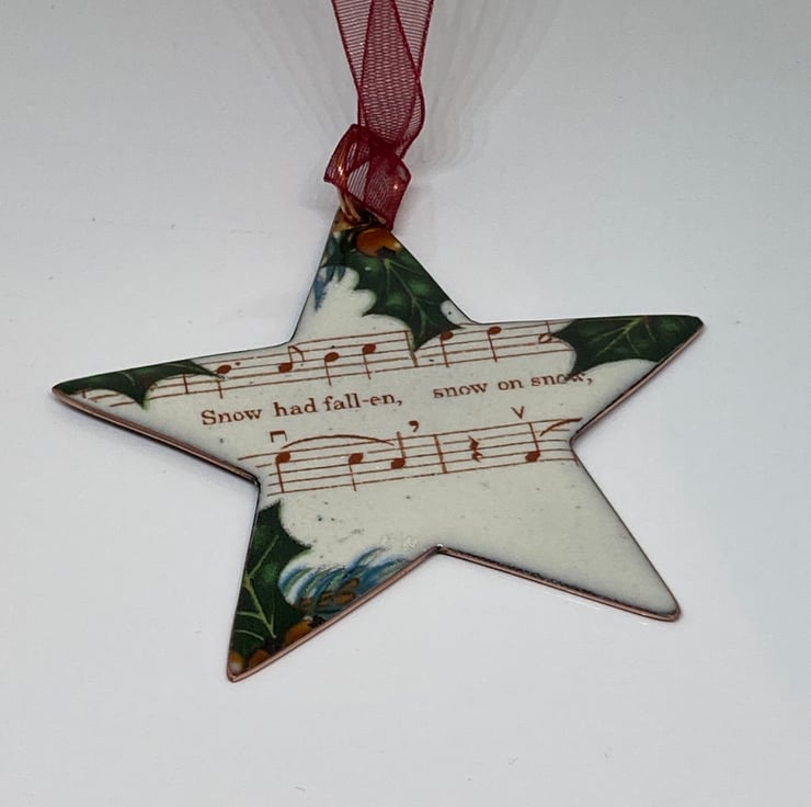 Christmas carol themed hanging decoration for your tree. This star is made from enamelled copper, is green on the back and ivory coloured on the front, which is decorated with a fragment of music from In the Deep Midwinter and holly leaves.