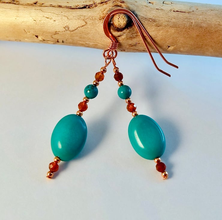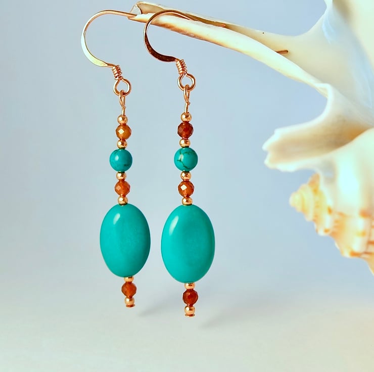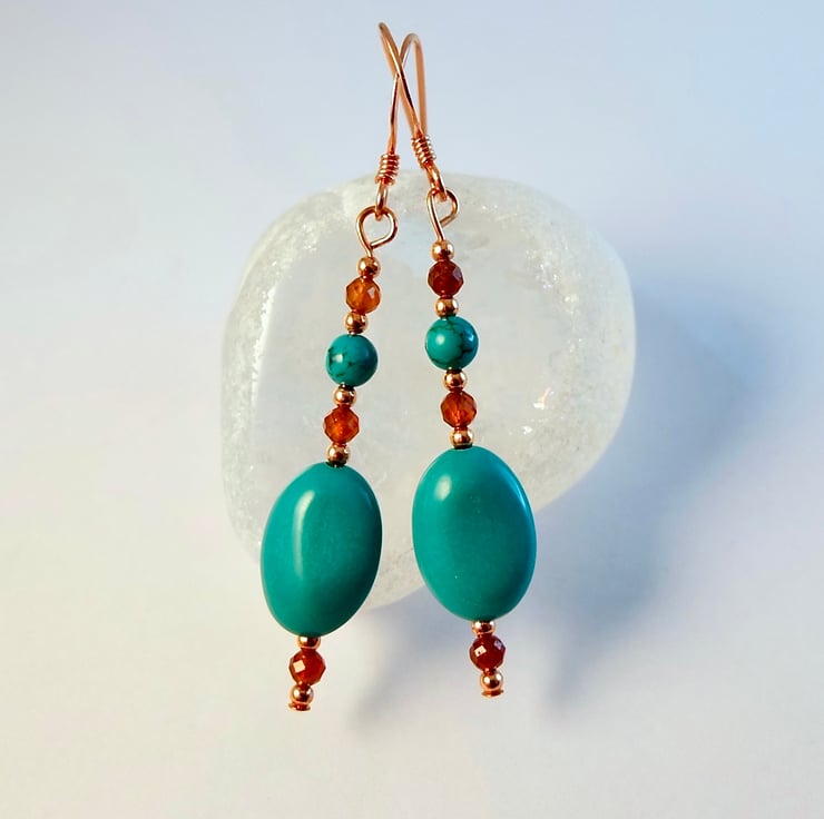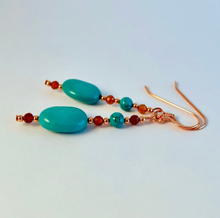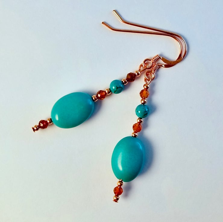 Each of these striking earrings features a 14x10x6mm Hubei Province Turquoise oval bead, topped with a 4mm Hubei Province Turquoise round, set between a pair of 3mm AAA grade faceted Hessonite Garnets, highlighted with 2mm copper spacer beads.