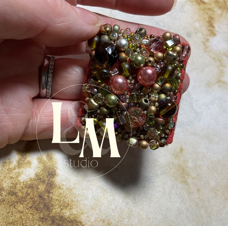 Hand stitched on linen, lightly padded with felt reverse & lots of pretty beads in lots of autumnal shades.