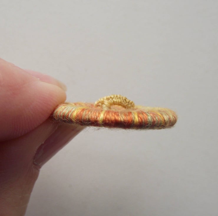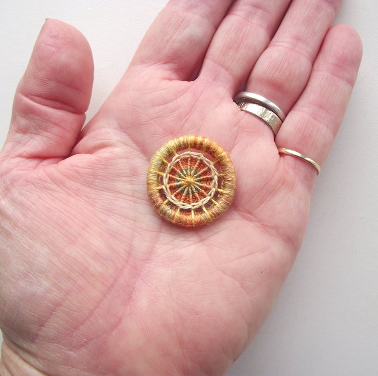 I made these Dorset buttons by working variegated and solid silk thread around brass rings. The colours are gold, soft orange and soft green. I added a chain stitch in a solid light gold silk thread. I have added thread shanks for easy sewing onto your project.