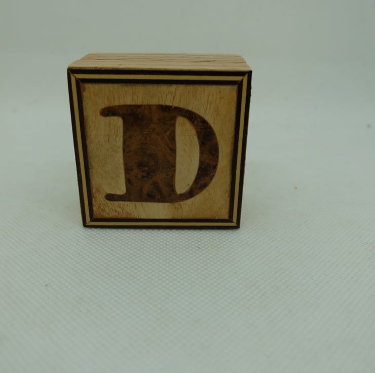 This is Letter D, dark wood letter in light wood background with border