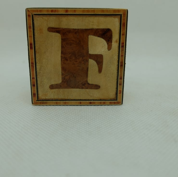 This is Letter F, red burr wood letter in light wood background with border