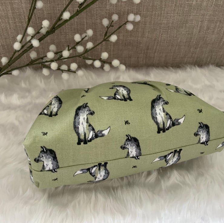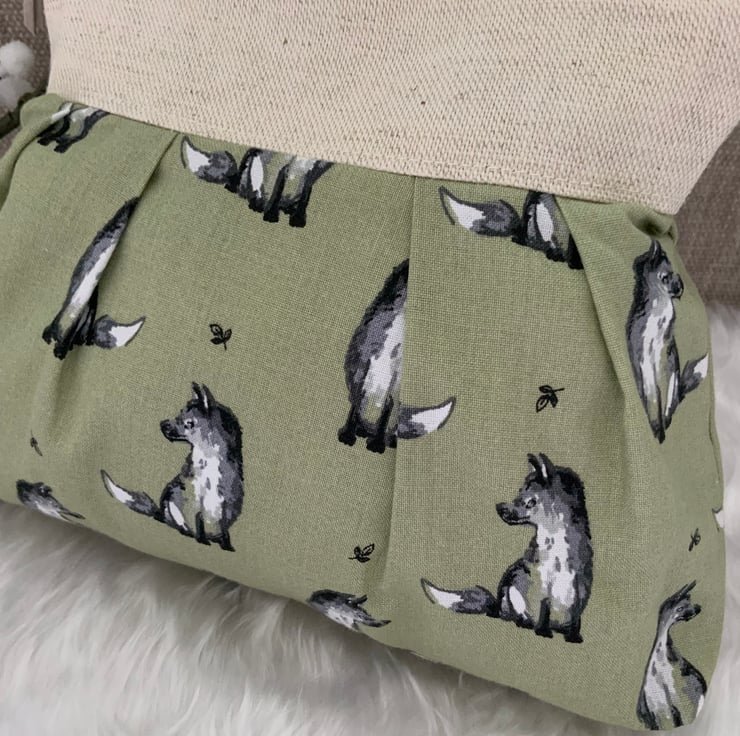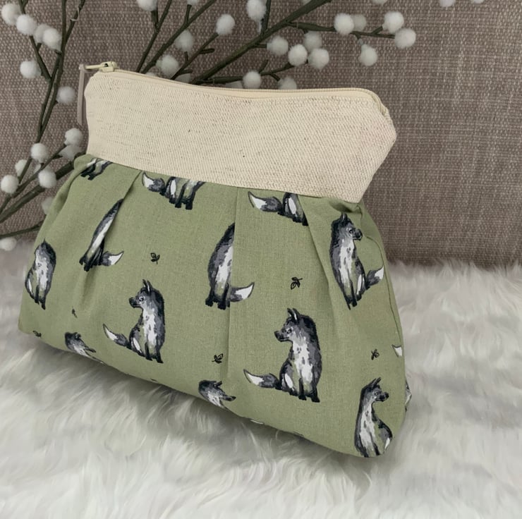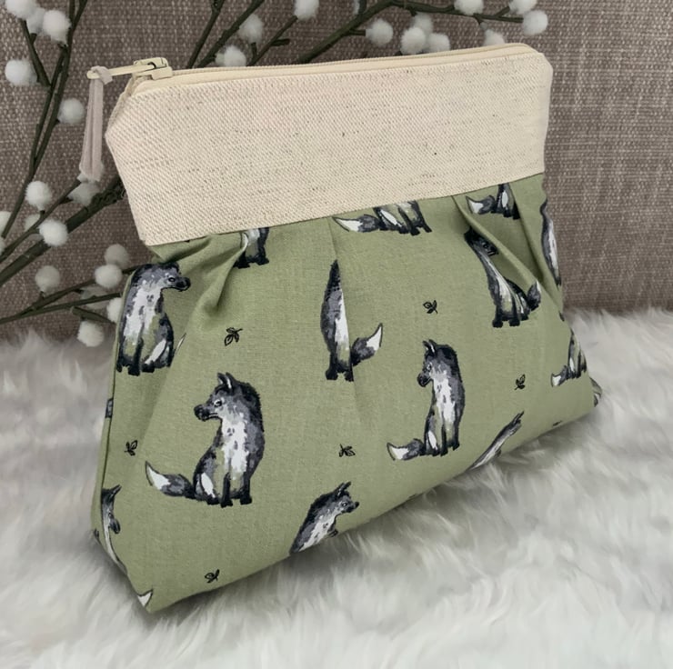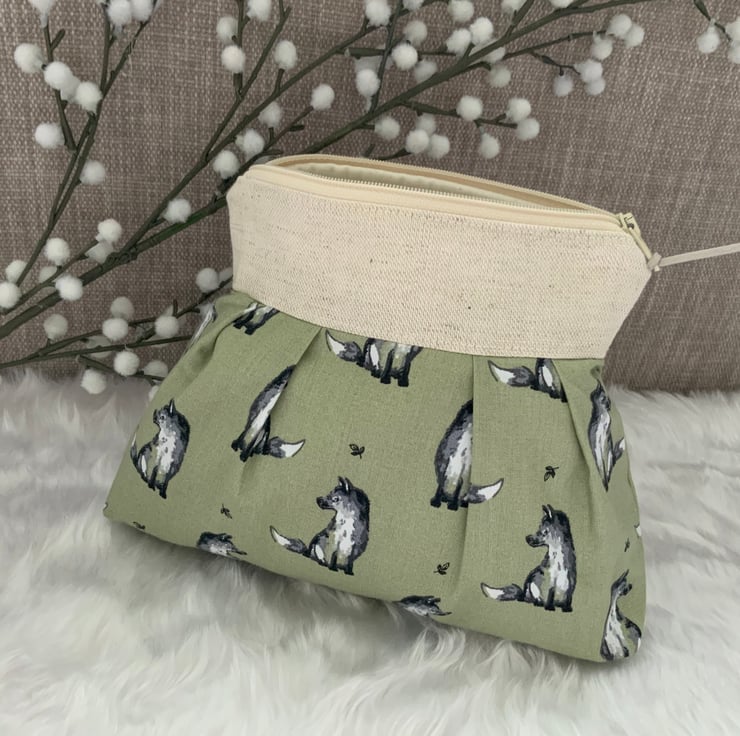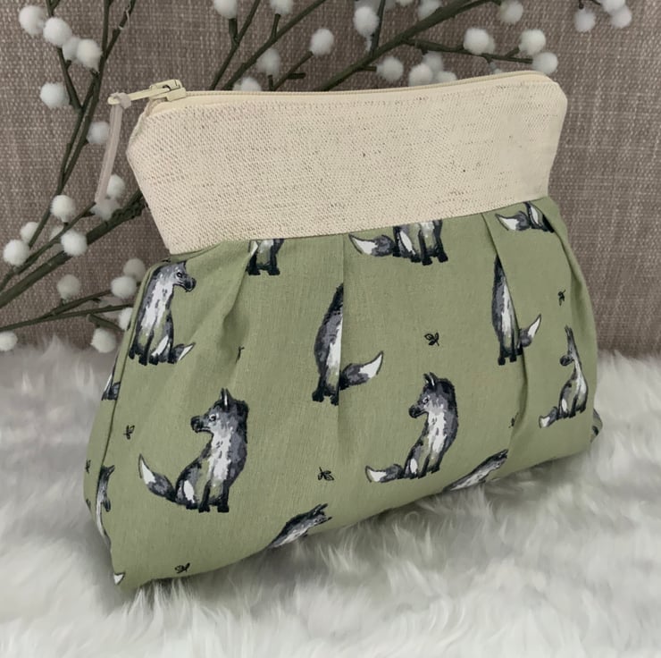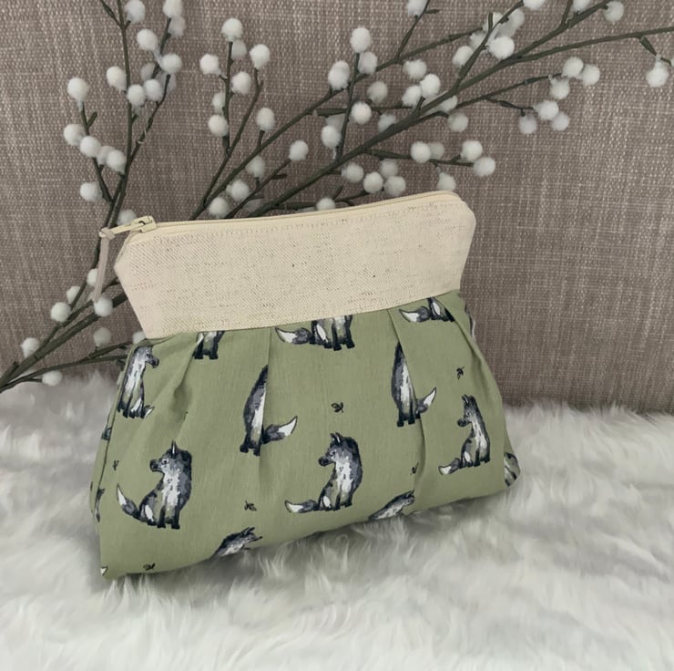 Beautiful pleated cosmetic make up bags, zipped purse. Natural linen band at top with pleated cotton fabric beneath and lined with cream cotton which is interlined to give it a little structure and soft to touch. Finished with faux suede cord on zip.