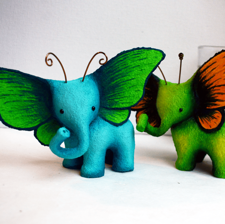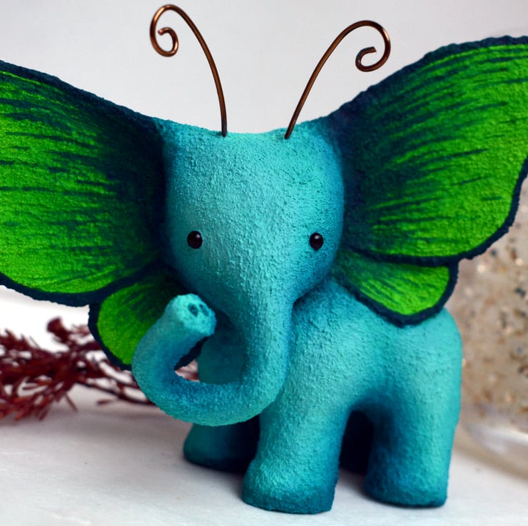 This utterly adorable little elephant might be visiting us from an alien planet, or perhaps it has escaped from a particularly quirky book of fairytales! Regardless, it is now looking for a loving home. It has butterfly wings for ears and a wonderfully bright turquoise and green colour scheme that will cheer up any nook or shelf.