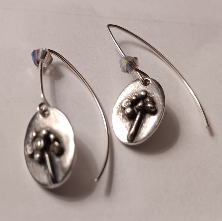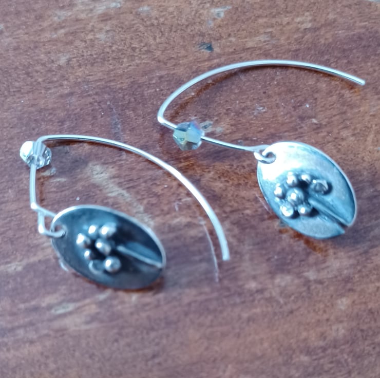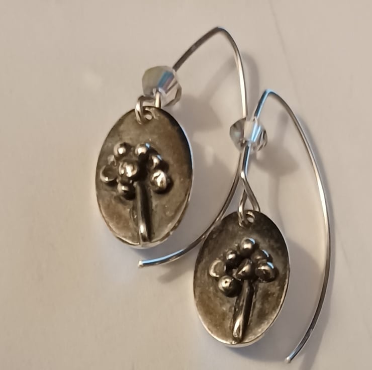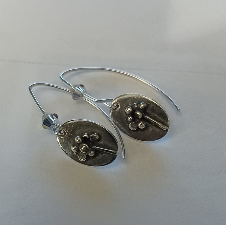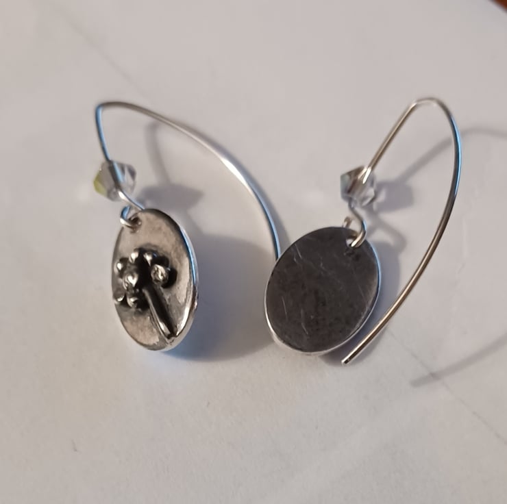 Pretty sterling silver flowers soldered onto oval discs which hang from handmade sterling silver earwires. The earwires each have a clear swarovski crystal bead for extra sparkle. The ovals are 1.5cm long and 1cm across at the widest part.