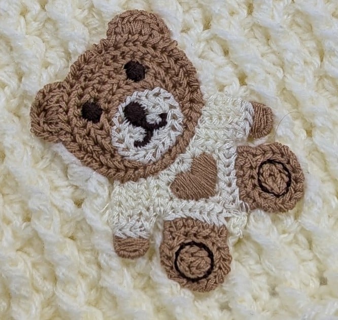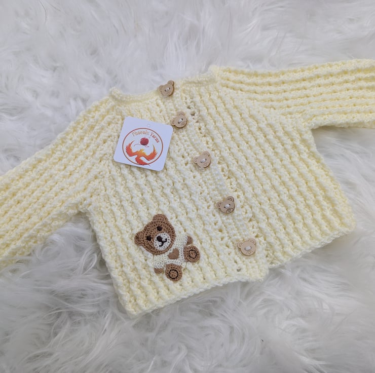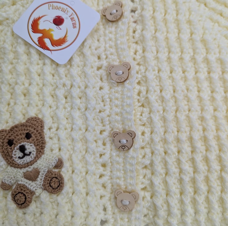 This gorgeous crochet cardigan is adorned with wooden teddy bear buttons and a lovely teddy motif.
