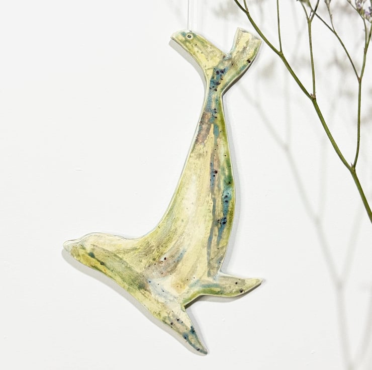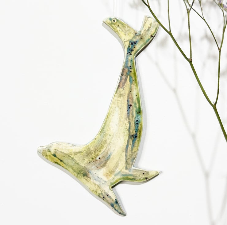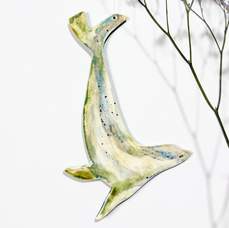 My ideas are heavily influenced by the beaches and countryside in Norfolk where I live. I glaze my ceramics by hand, painting with small paint brushes and so once the kiln works its magic, each item is unique. Each of my ceramic hanging seals is painted by hand with glazes inspired by the Norfolk coast. This seal is 24cm wide; it has a thickness of around 4mm.