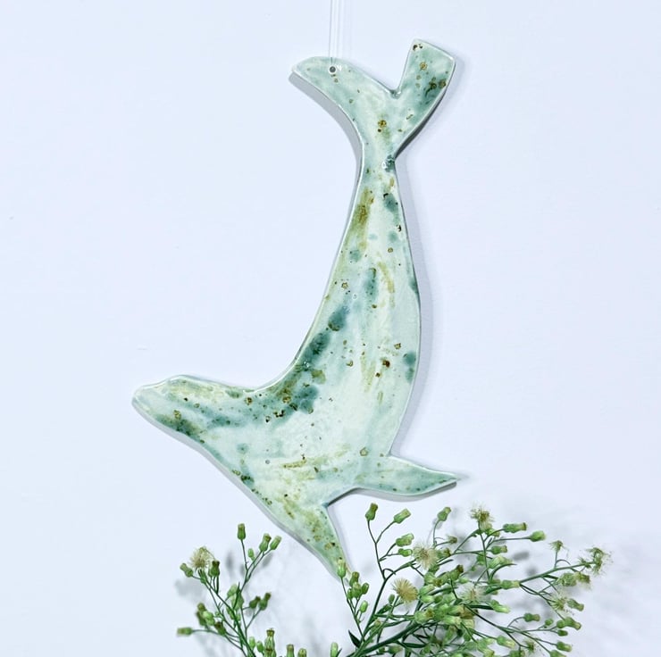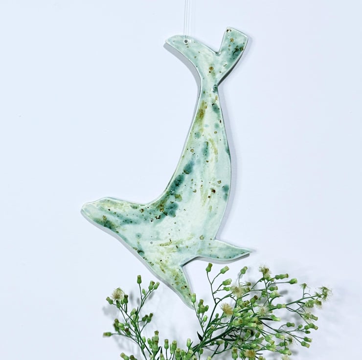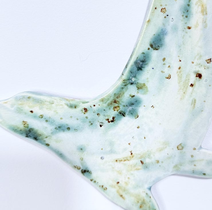 Hand made ceramic hanging seal, painted by hand with glazes inspired by the Norfolk coast. This seal is 24cm wide; it has a thickness of around 4mm. I also have a range of hanging birds, all handpainted with different glazes.