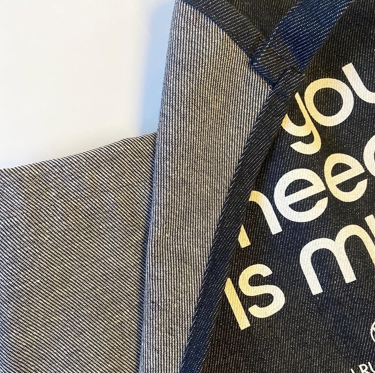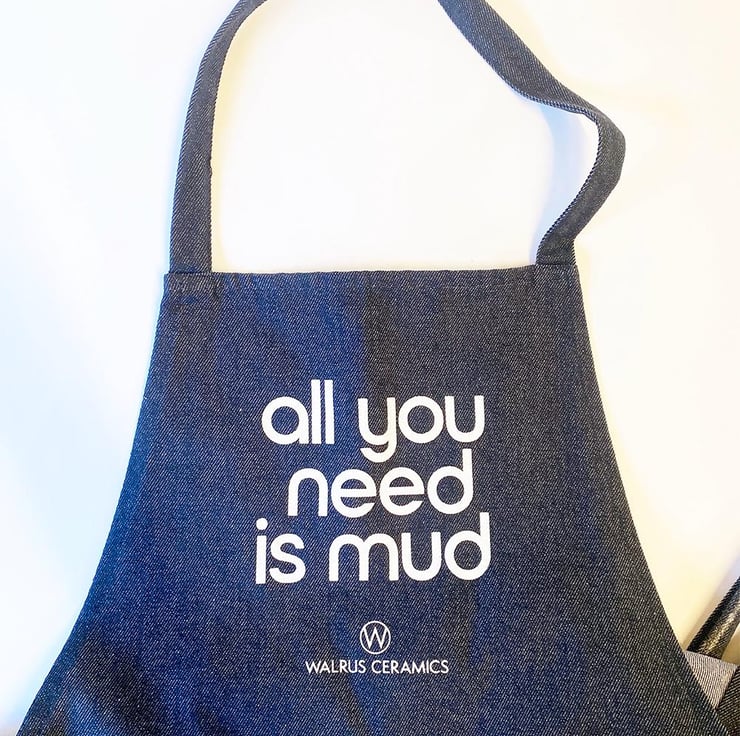 This apron is made from thick recycled denim with my design 'all you need is mud' screen-printed on it. The apron measures 70 x 100 cm and is perfect for pottery studio days. Made from 70% recycled cotton and 30% recycled polyester, this apron is thick, sturdy, and comfortable. It includes two adjacent pockets and a one-meter-long tie-back closure for easy adjustment.