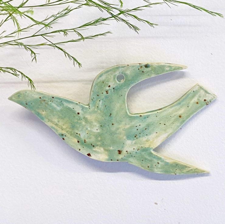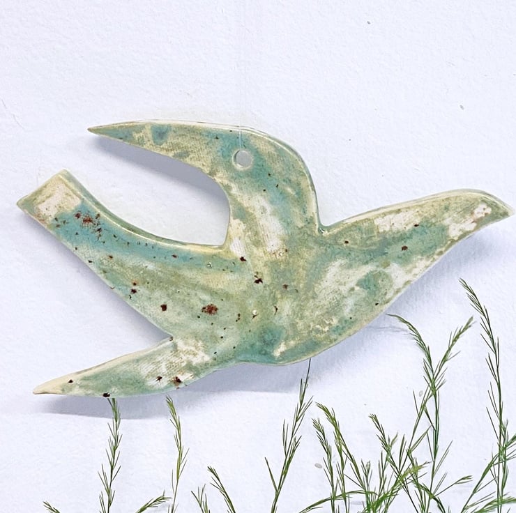 Hand made ceramic hanging bird, painted by hand with glazes inspired by the Norfolk countryside and coast. This bird is 16cm wide; it has a thickness of around 4mm. This is one of my medium birds, others are available in a larger or smaller size should you want a set.