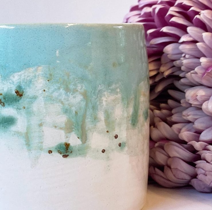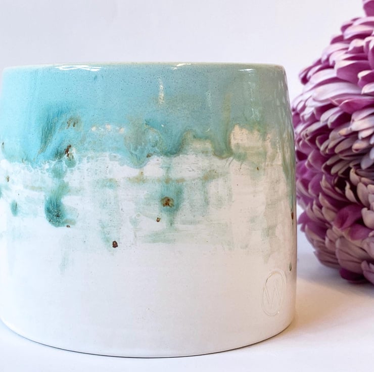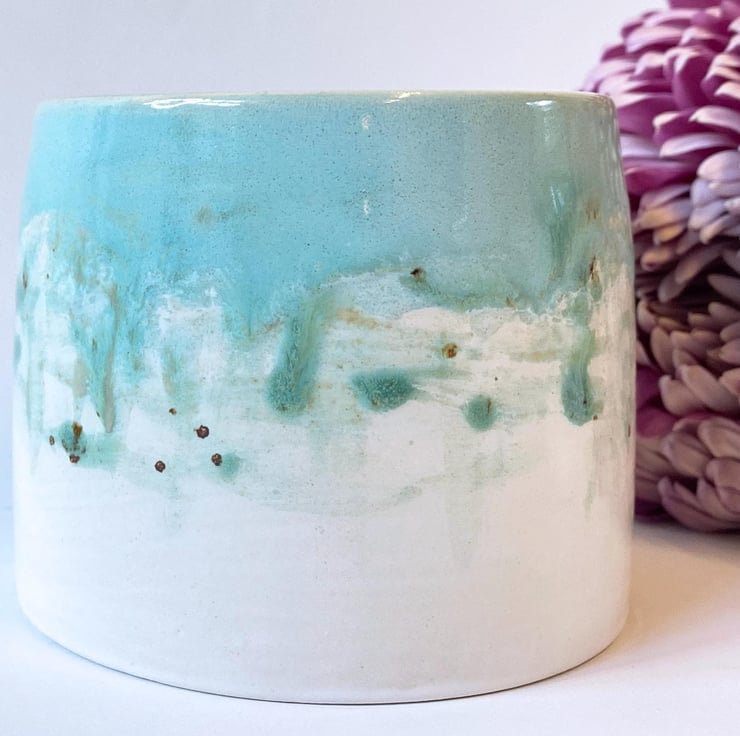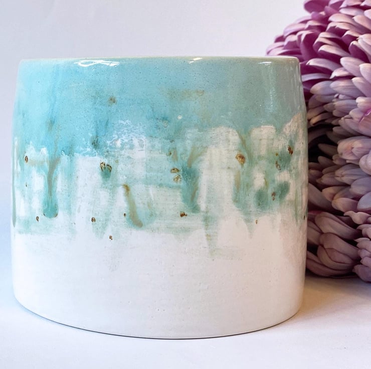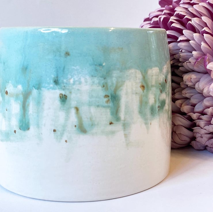 All of my pottery is influenced by the countryside in Norfolk where I live. I glaze my ceramics by hand, painting with small paint brushes and so once the kiln works its magic, each item is unique. This planter has been thrown on the wheel and glazed in a painterly watercolour style by hand in turquoise, blues and green