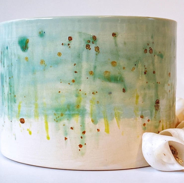 Thrown on the wheel and glazed by hand by me in shades of blue, turquoise & white, inspired by the Norfolk coastline.