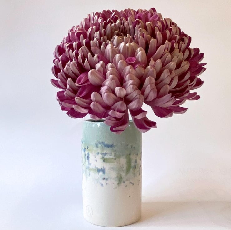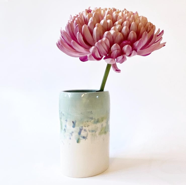 I've made the vase on my pottery wheel in my Norfolk studio. I am heavily influenced by the countryside in Norfolk where I live and have hand-glazed this vase using shades of blue and white. The vase looks lovely with contrasting foliage or with dried flowers and grasses. This vase measures: height 10.5cm & diameter 6.5cm.
