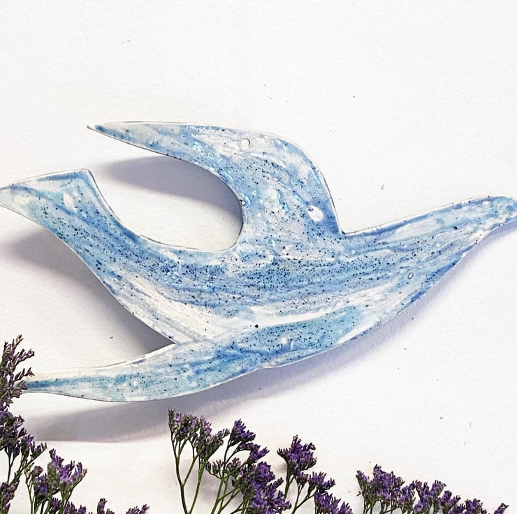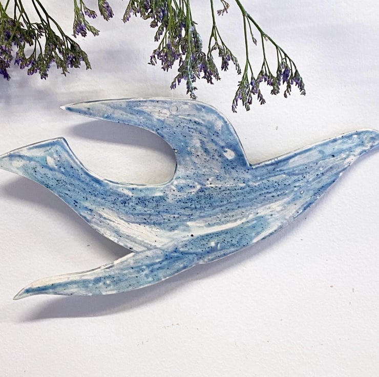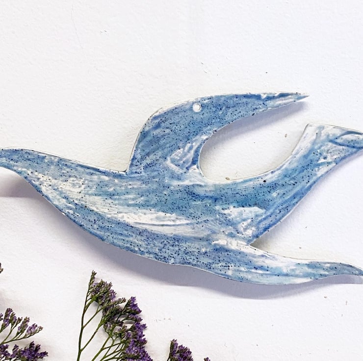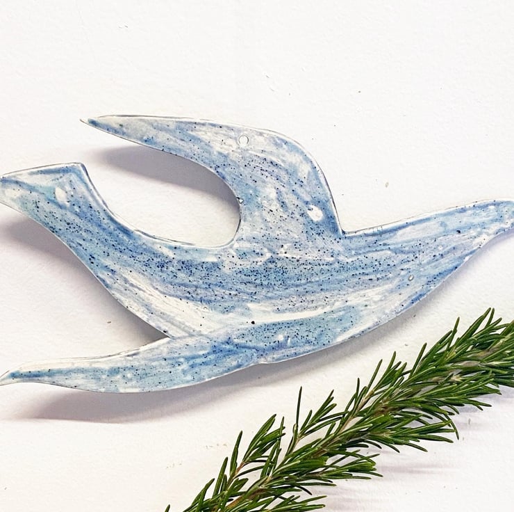 Hand made ceramic hanging bird, painted by hand with glazes inspired by the Norfolk countryside and coast. This bird is 24cm wide; it has a thickness of around 4mm. This is one of my large birds, others are available in two smaller sizes should you want a set.