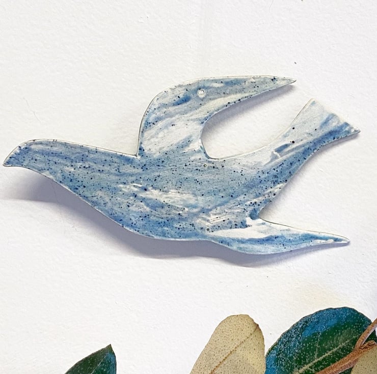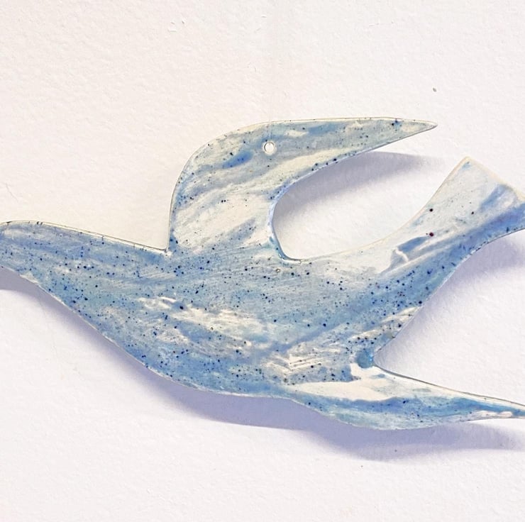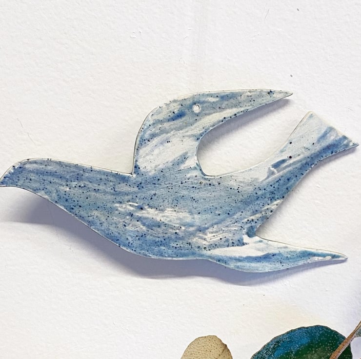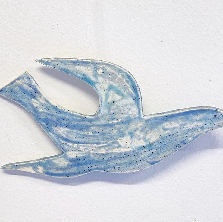 Hand made ceramic hanging bird, painted by hand with glazes inspired by the Norfolk countryside and coast. This bird is 12cm wide; it has a thickness of around 4mm.