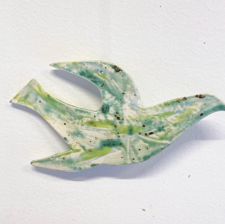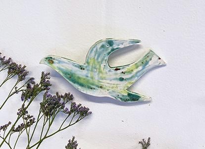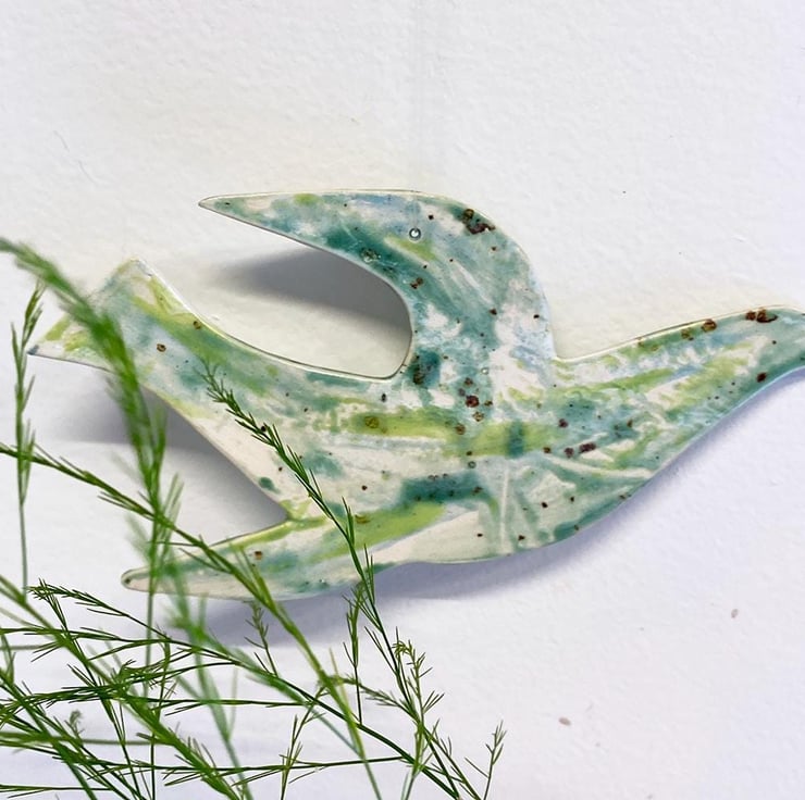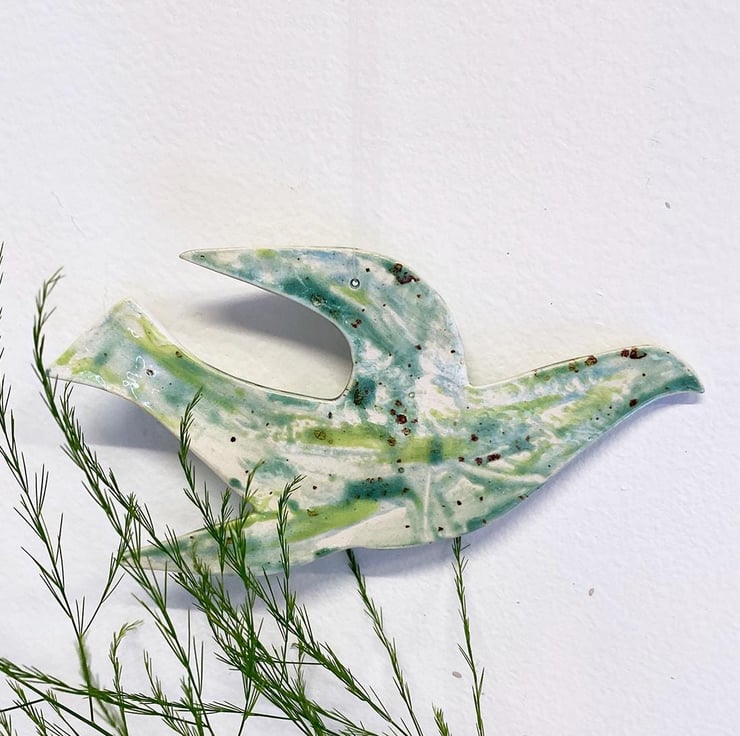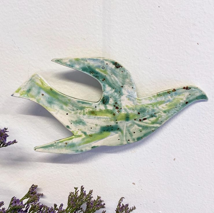 Hand made ceramic hanging bird, painted by hand with glazes inspired by the Norfolk countryside and coast. This bird is 16cm wide; it has a thickness of around 4mm. This is one of my larger birds, others are available in a larger or smaller size should you want a set.