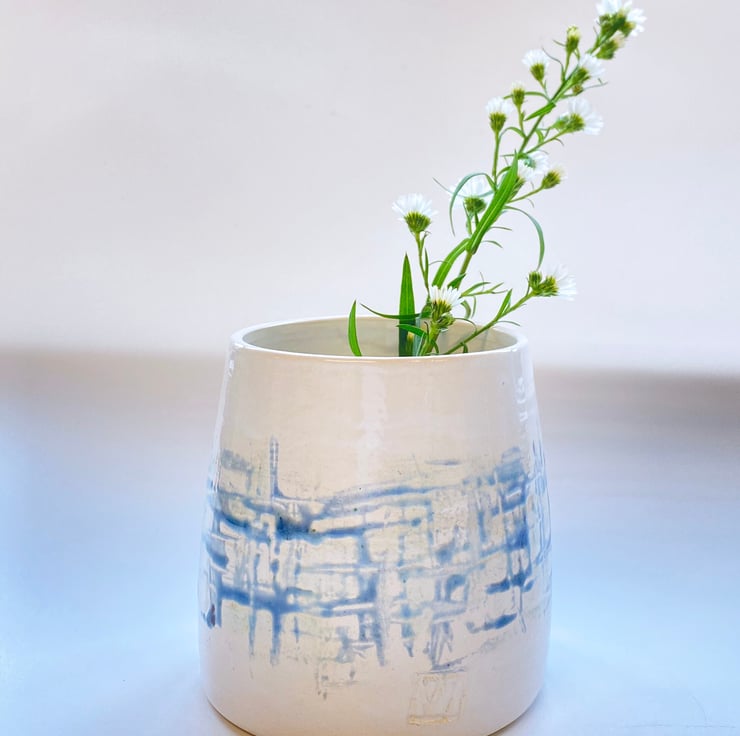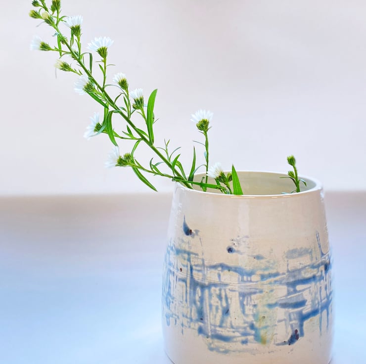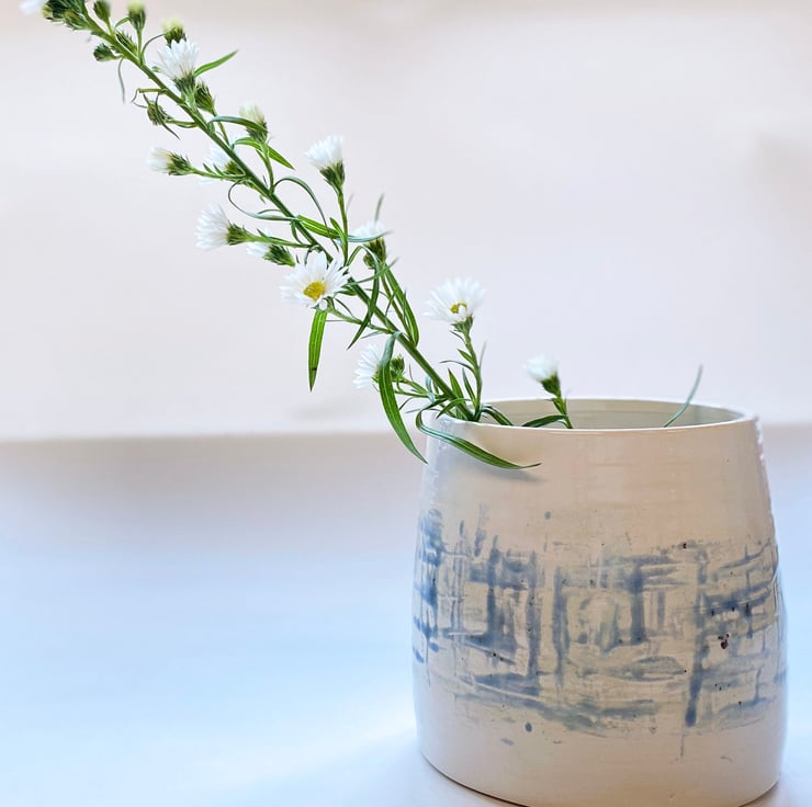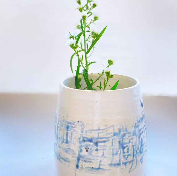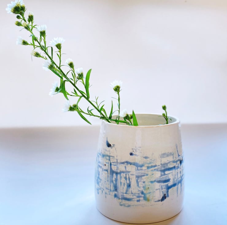 This planter has been thrown on the wheel and glazed in a painterly watercolour style by hand in blues and green -inspired by the sea and the Norfolk coastline.