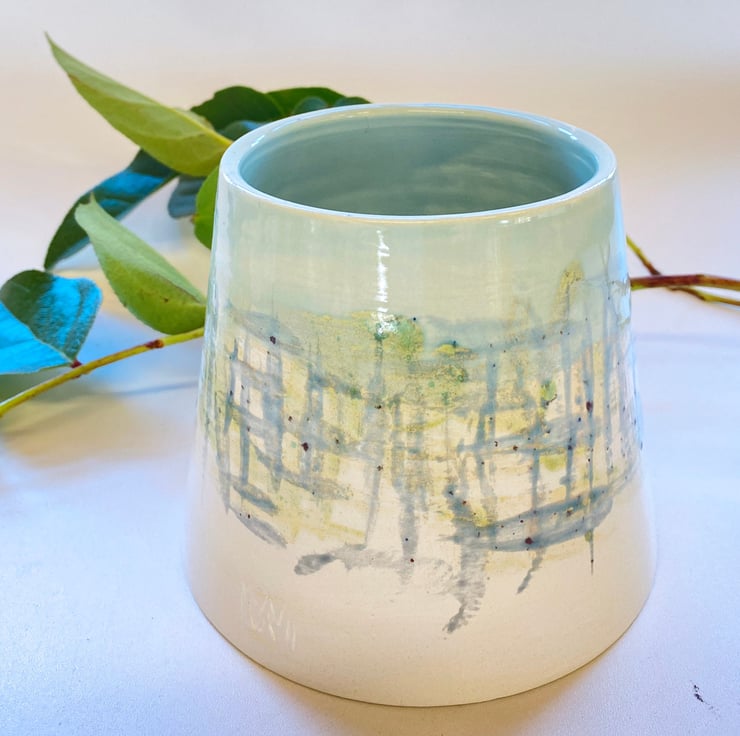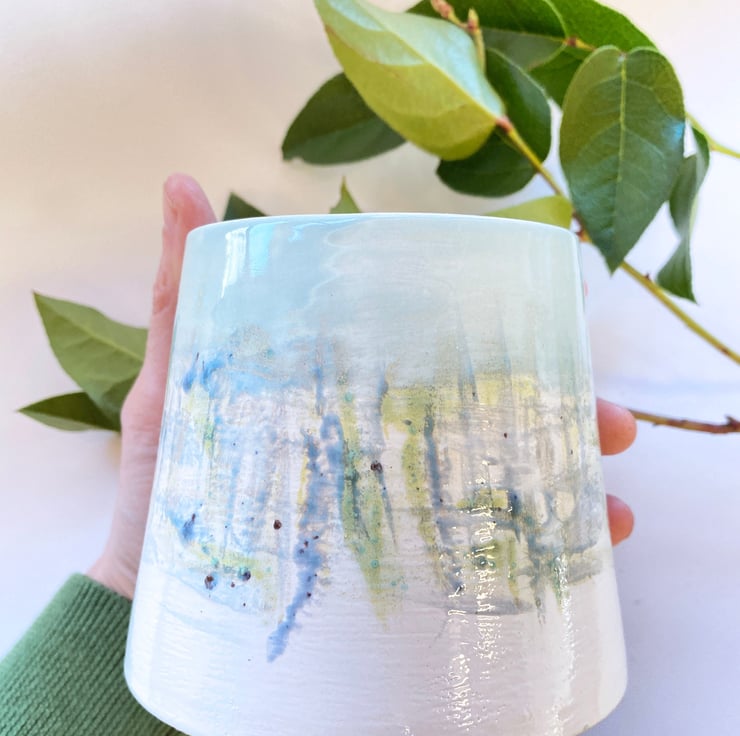 My pottery is heavily influenced by the countryside in Norfolk where I live. I glaze my ceramics by hand, painting with small paint brushes and so once the kiln works its magic, each item is unique. This planter has been thrown on the wheel and glazed in a painterly, watercolour style by hand in blues, greens and yellows -inspired by the sea and the Norfolk coastline. I love the way this combination gives the impression of fish swimming around the pot. This pot measures: height 9cm; top diameter 8cm and at the base 11cm.