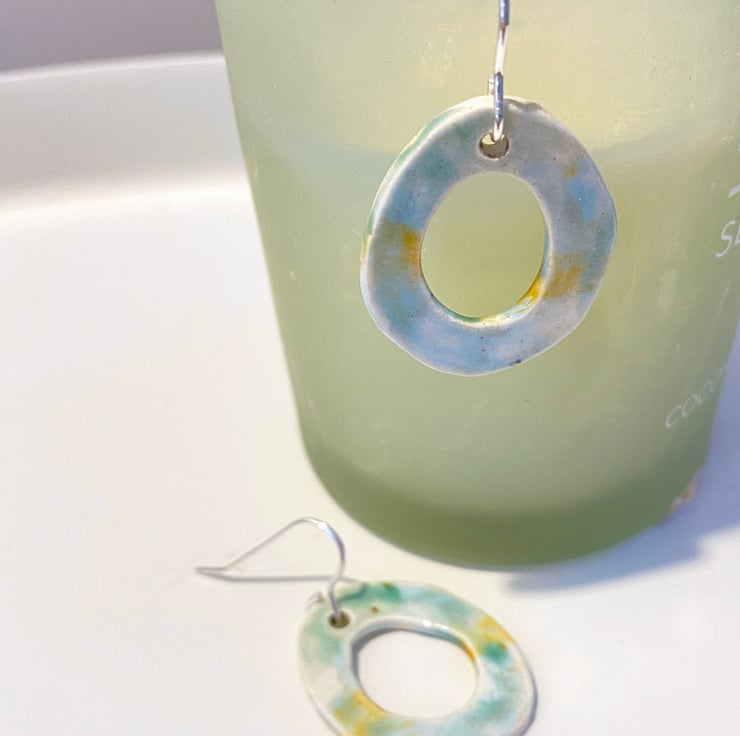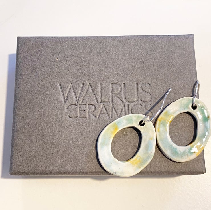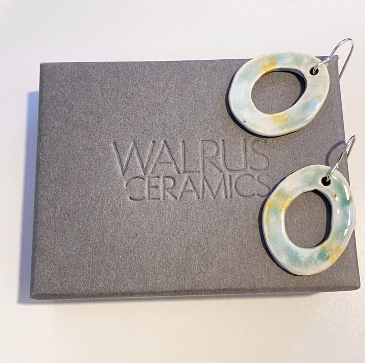 All my jewellery is influenced by the beaches and countryside in Norfolk where I live. I glaze each piece of ceramic by hand with care and so once the kiln works its magic, each item is unique. These earrings are a sample design.