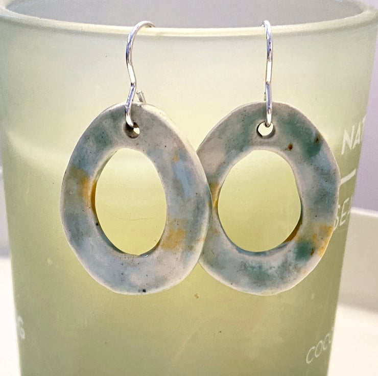 Every piece I make is glazed by hand and so they all vary, these earrings are organic in shape and remind me of beach pebbles. I Each earrings is glazed on both sides.