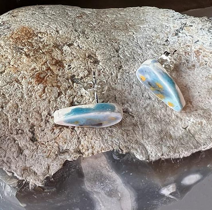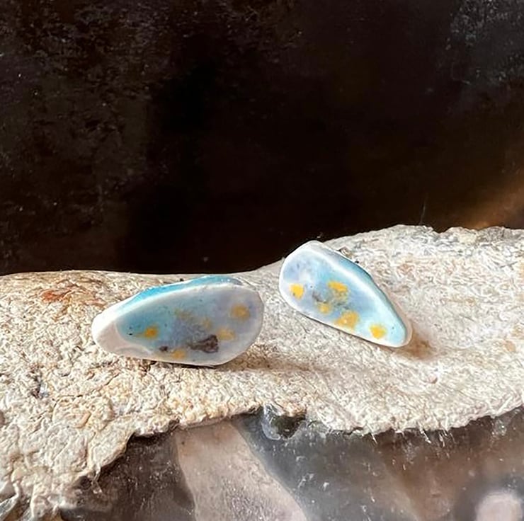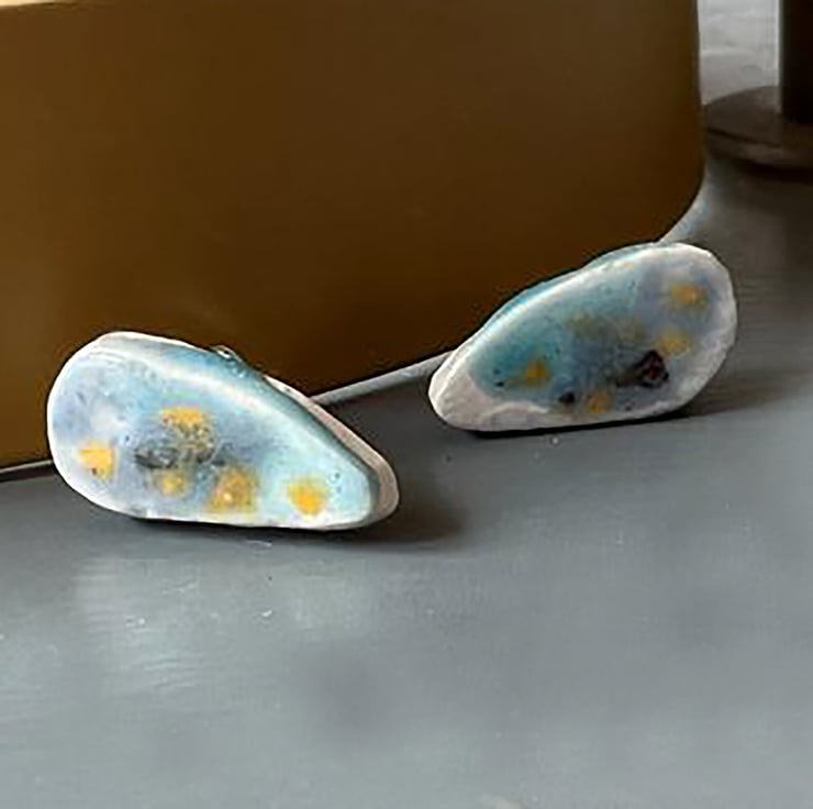 These stud earrings have a simple organic shape which hangs slightly below the earlobe. I am inspired by the colours from the Norfolk countryside and beaches near where I'm lucky enough to live. Each earrings is glazed on both sides. Every piece I make is glazed by hand and so each pair is unique, this is a sample pair & the ceramic elements are approximately 17 x 8mm.